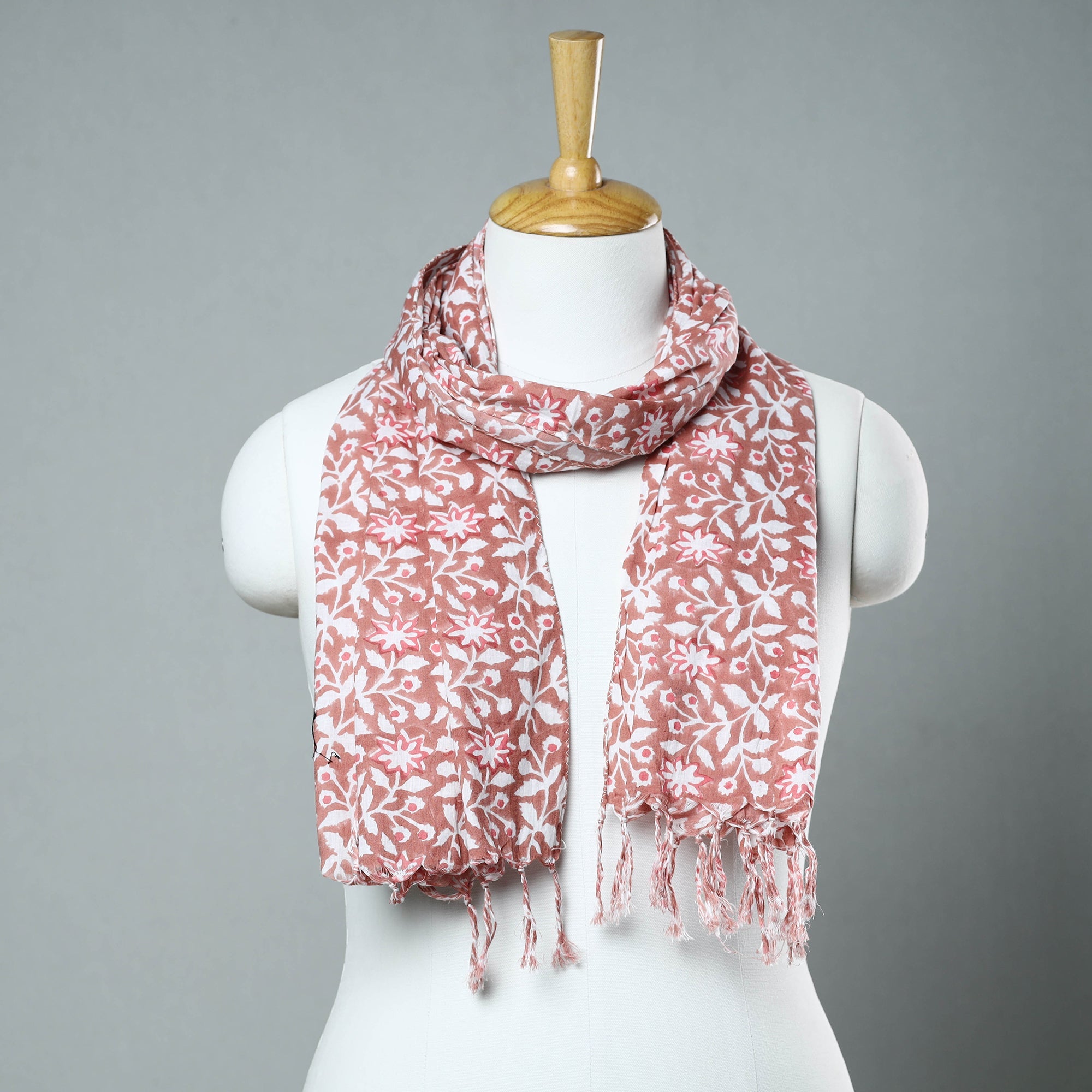 Brown - Sanganeri Block Printed Cotton Stole with Tassels 70