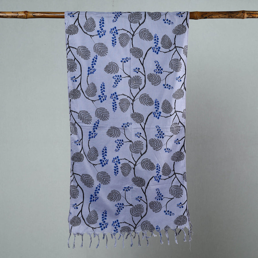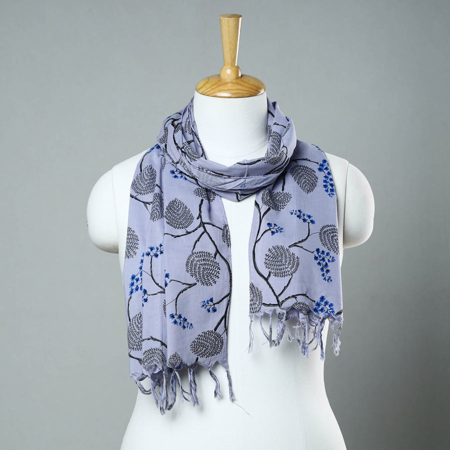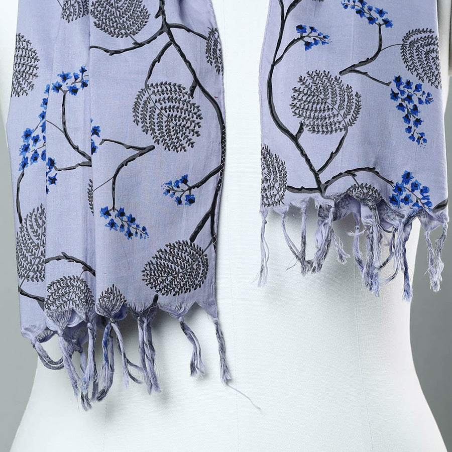 Fine quality delicate sanganeri block printed cotton stole with tassels. Made using VAT dyes, this stole features intricate floral patterns, also known as 'Buttas', which are exclusive to sanganeri prints. The elaborate detailing of the flowers and petals showcases the artistry of this hand-block printing technique originating from Sanganer, Rajasthan.