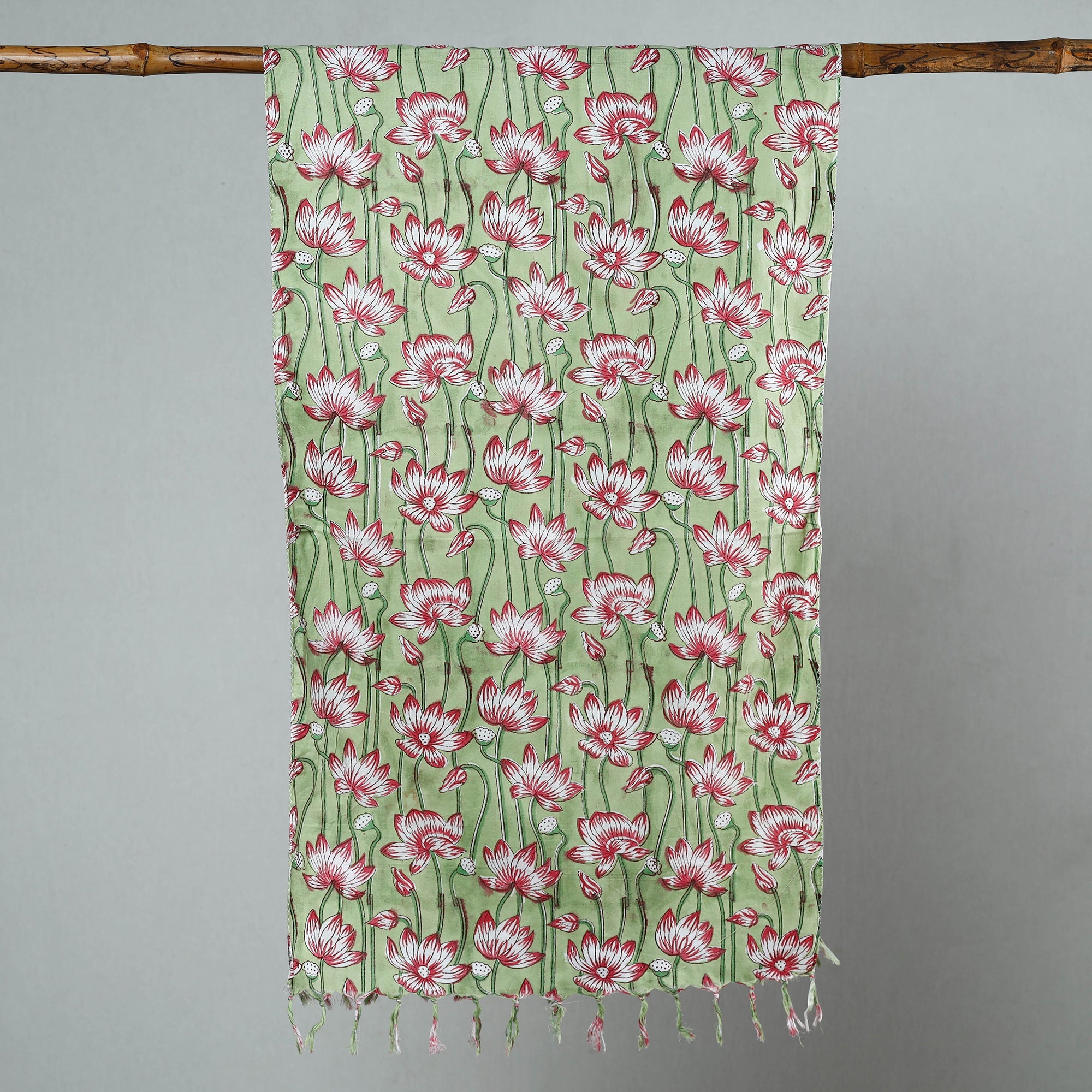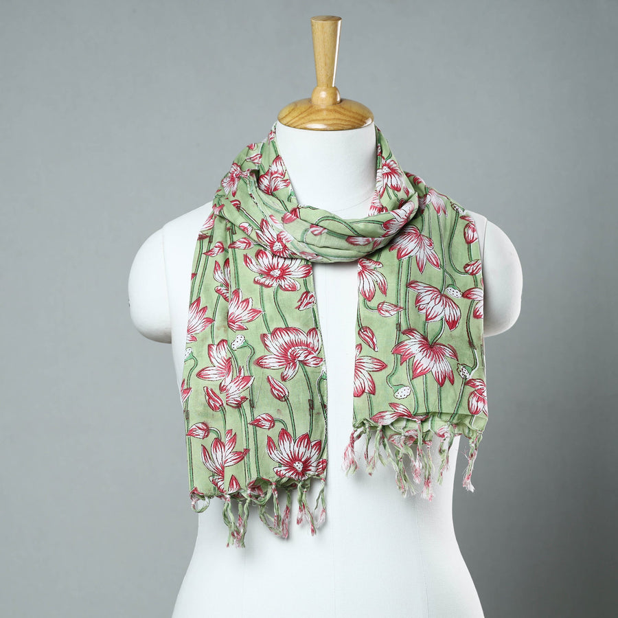 Green - Sanganeri Block Printed Cotton Stole with Tassels 87