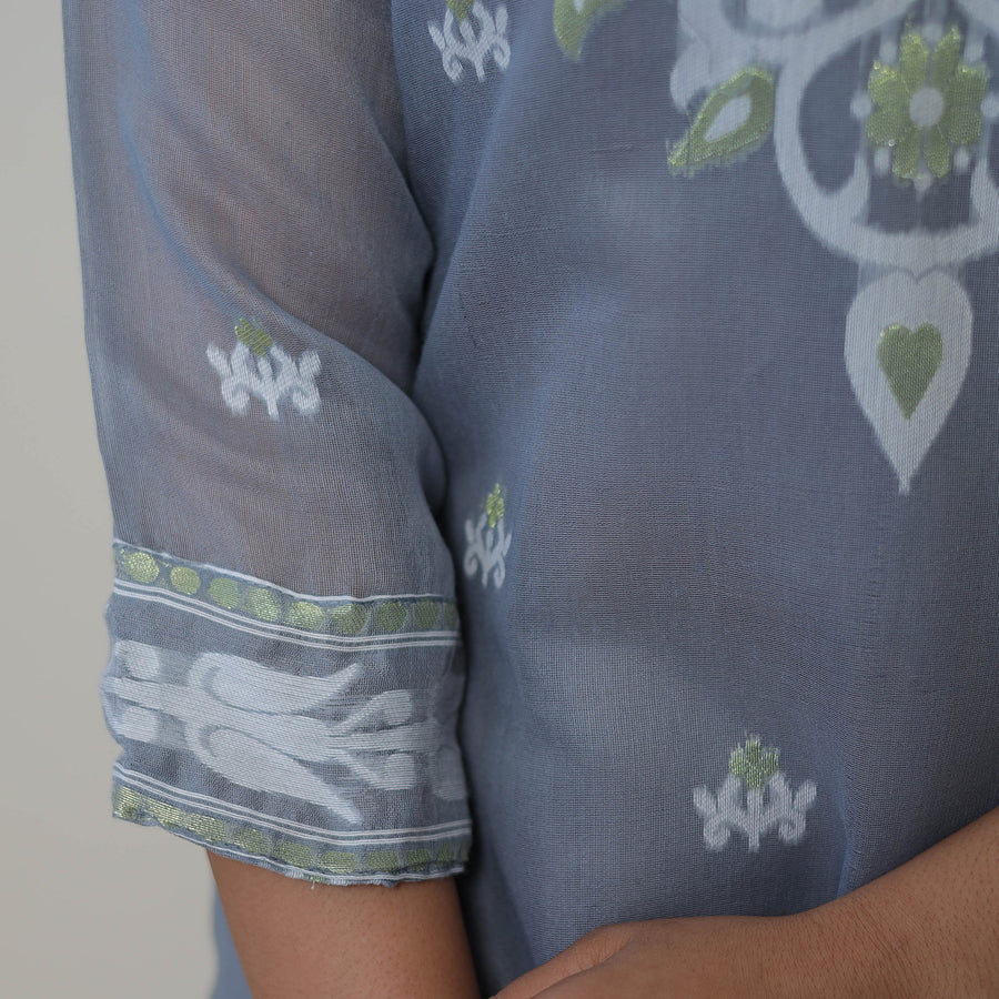 Look and feel beautiful in this uniquely designed bengal jamdani silk-cotton one side pocket long kurta with dupatta set. This silk-cotton suit makes you comfortable all day long. This suit is perfect for your special occasion.