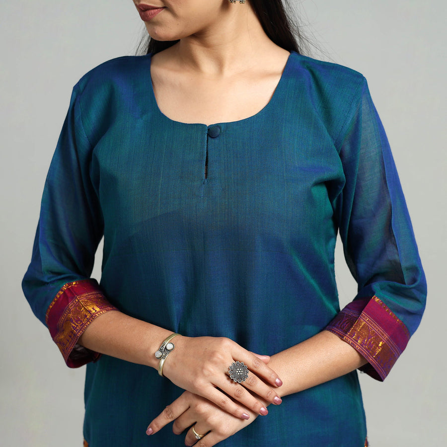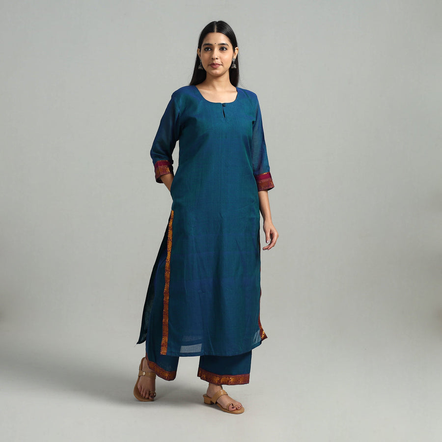 This uniquely designed cotton blue dharwad kurta set with palazzo & dupatta is the perfect blend of comfort and style. This kurta set is crafted from cotton fabric, ensuring a comfortable feel against your skin. The kurta also features a convenient one-side pocket, perfect for carrying small essentials, and the palazzo features an elasticized waist and two side pockets, adding functionality to this palazzo. It boasts an exquisite border, adding a touch of elegance to your ensemble.