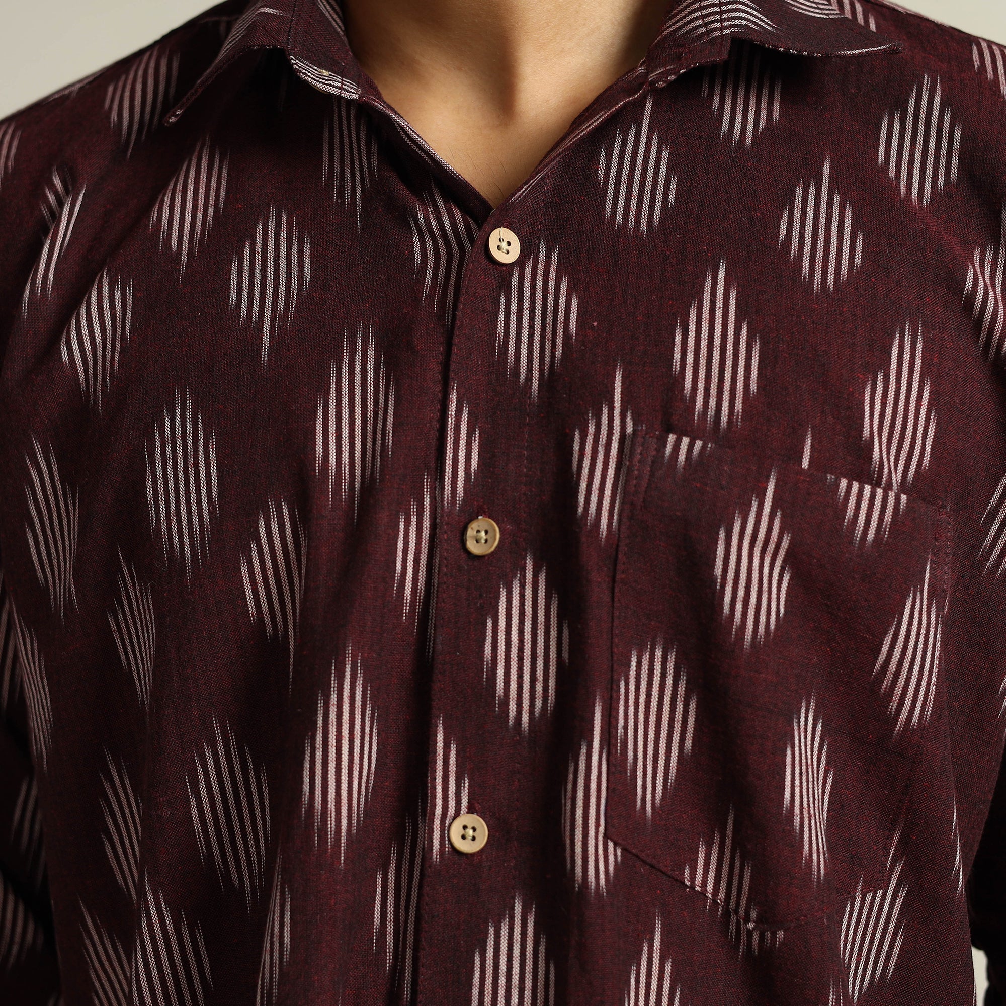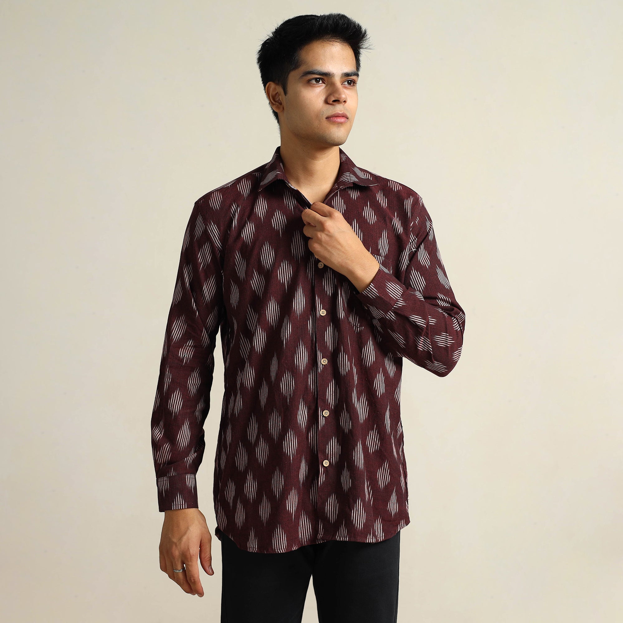 This pochampally ikat weave cotton men's full-sleeve shirt is the perfect blend of style and comfort. This shirt is carefully crafted from cotton fabric, which ensures all-day comfort. The crisp wooden buttons add a touch of natural charm, while the patch pocket on the front offers convenience and practicality.
