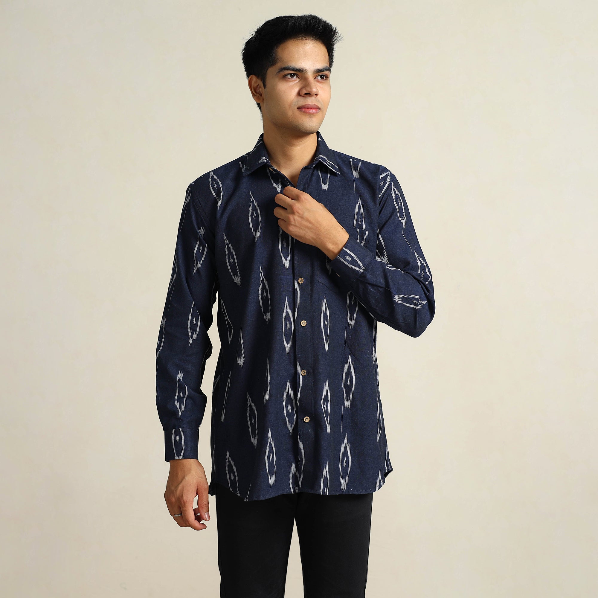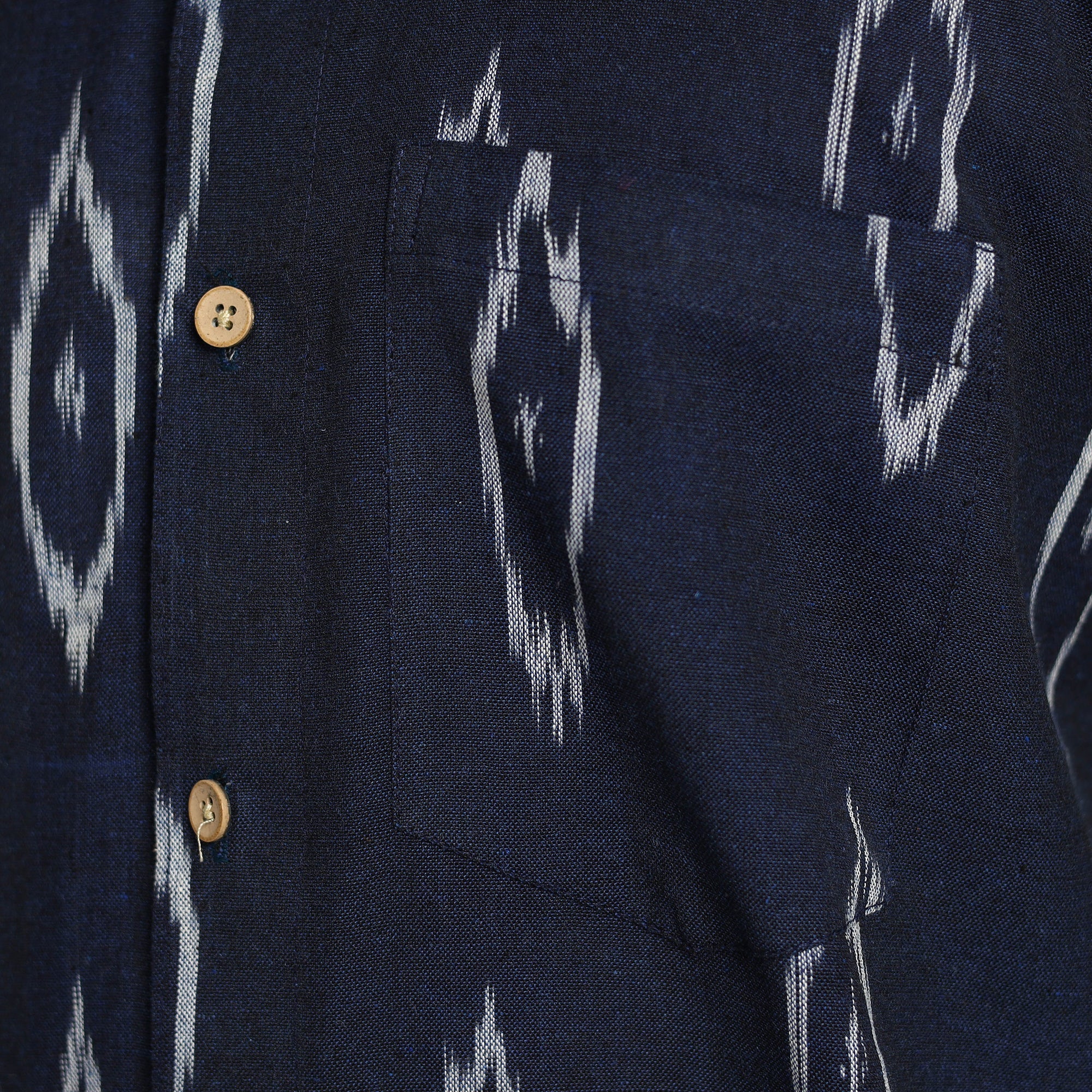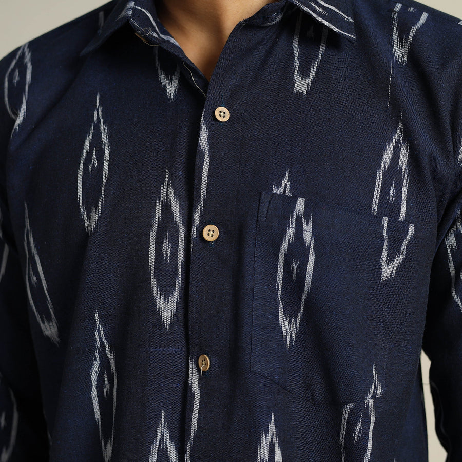 This pochampally ikat weave cotton men's full-sleeve shirt is the perfect blend of style and comfort. This shirt is carefully crafted from cotton fabric, which ensures all-day comfort. The crisp wooden buttons add a touch of natural charm, while the patch pocket on the front offers convenience and practicality.