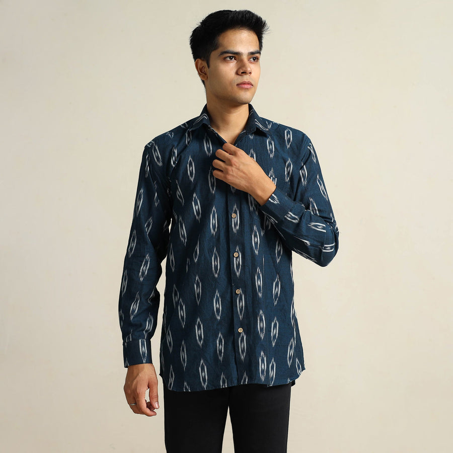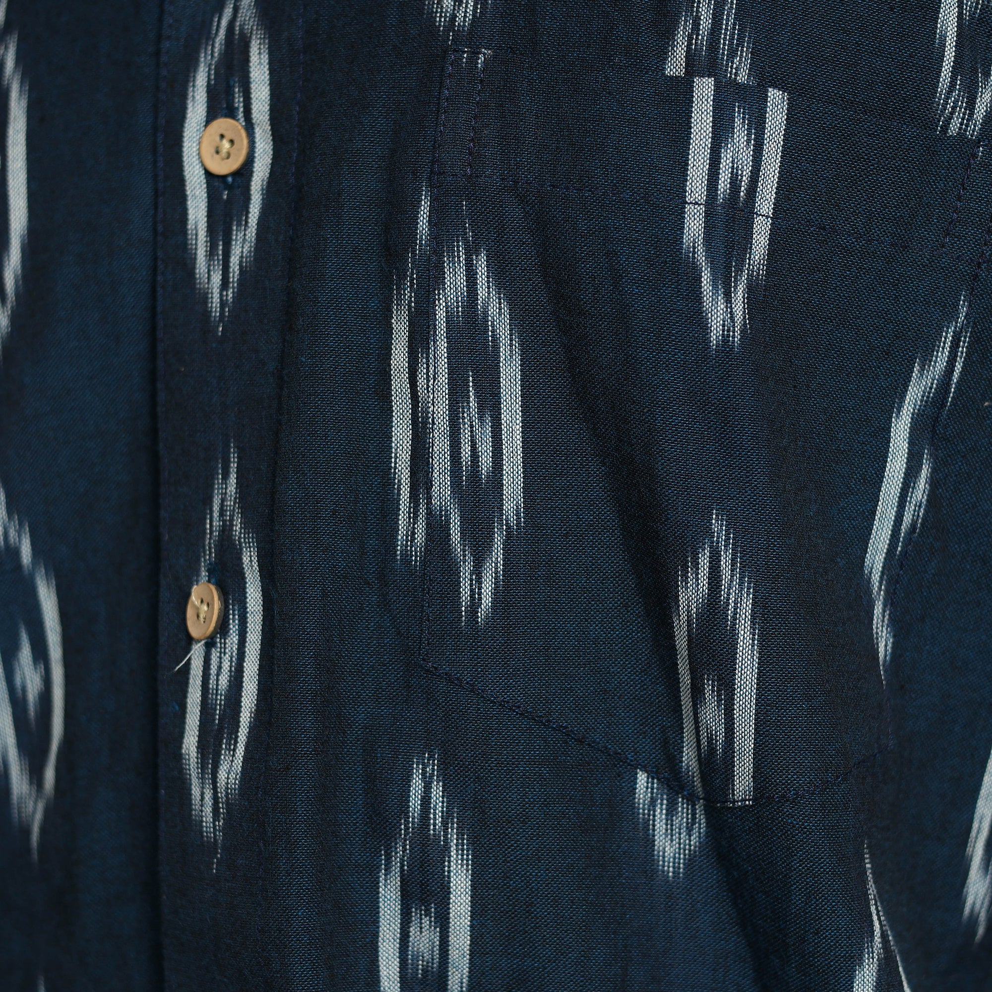 This pochampally ikat weave cotton men's full-sleeve shirt is the perfect blend of style and comfort. This shirt is carefully crafted from cotton fabric, which ensures all-day comfort. The crisp wooden buttons add a touch of natural charm, while the patch pocket on the front offers convenience and practicality.