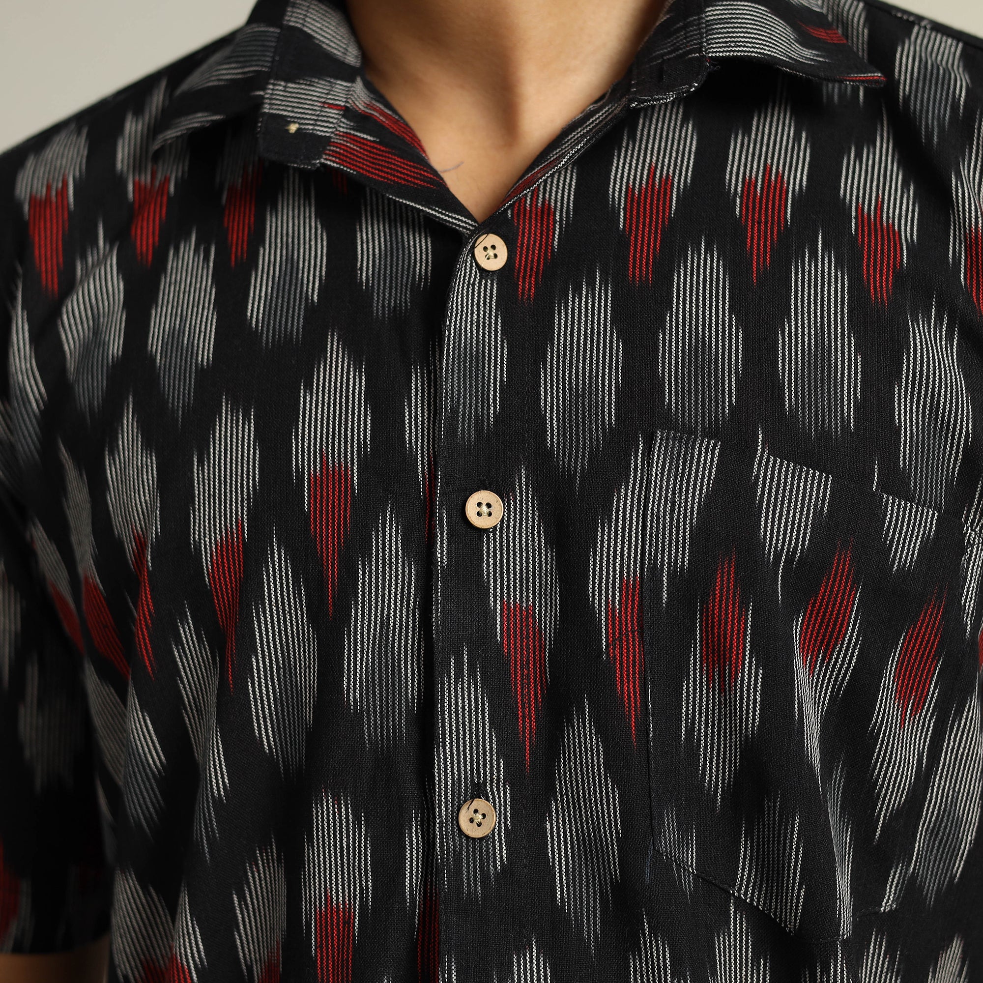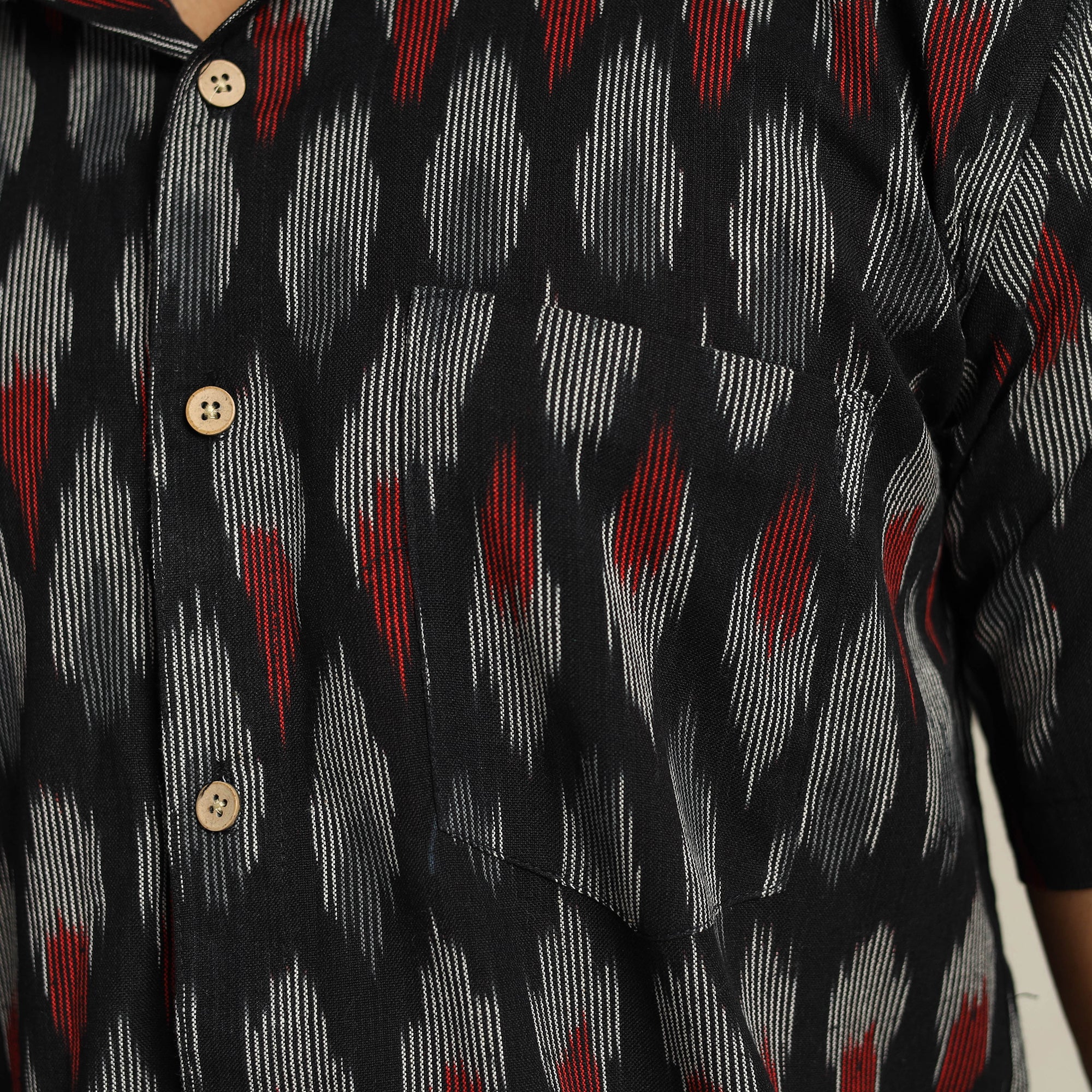 This pochampally ikat weave cotton men's half-sleeve shirt is the perfect blend of style and comfort. This shirt is carefully crafted from cotton fabric, which ensures all-day comfort. The crisp wooden buttons add a touch of natural charm, while the patch pocket on the front offers convenience and practicality.