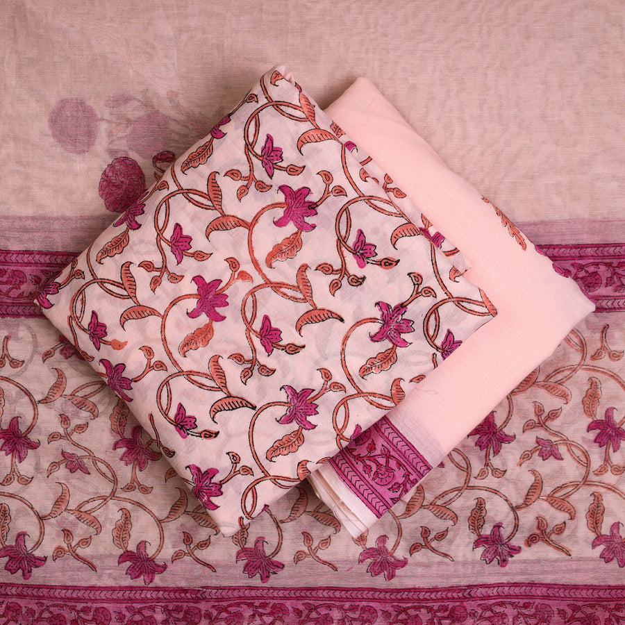 Elevate your style with this exquisite 3-piece sanganeri block printed cotton unstitched suit material with a chanderi silk zari border dupatta. This suit material has been created using the technique of hand block printing originating from Jaipur, Rajasthan.