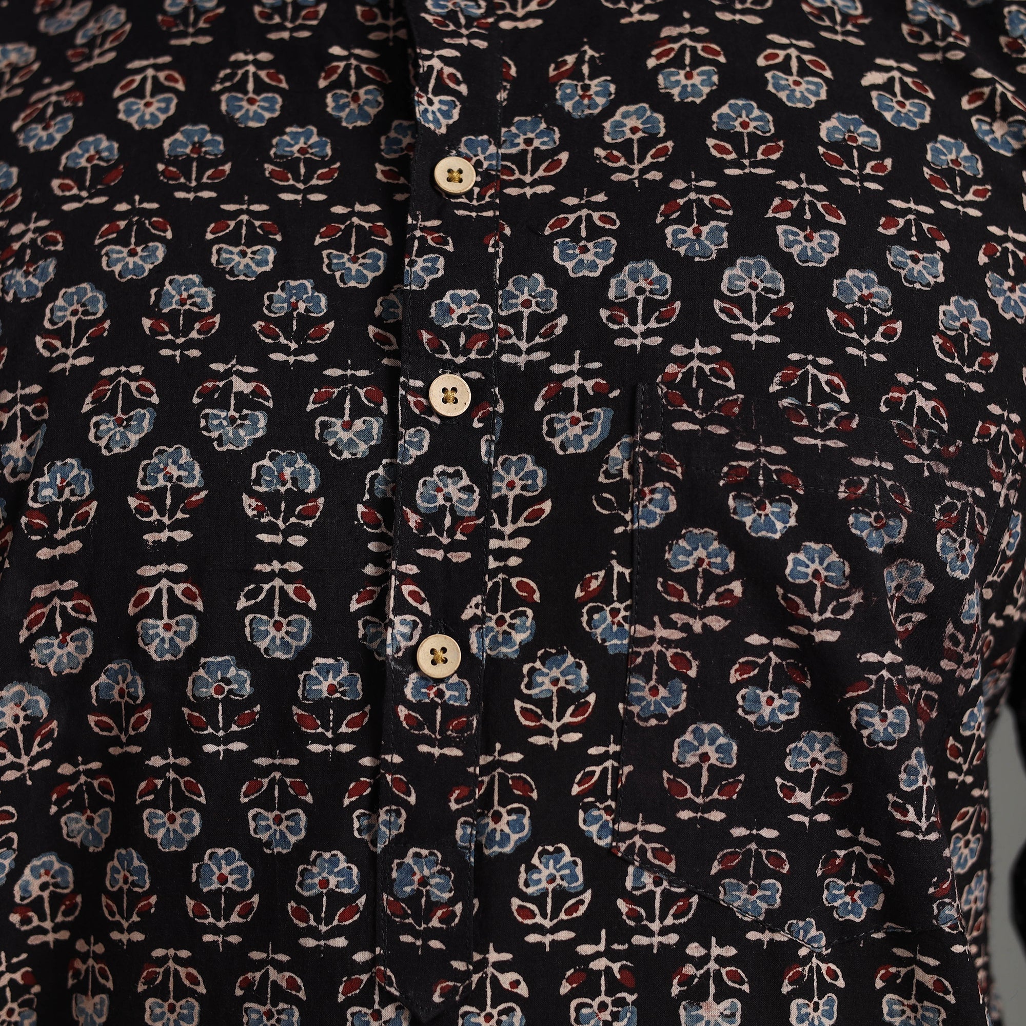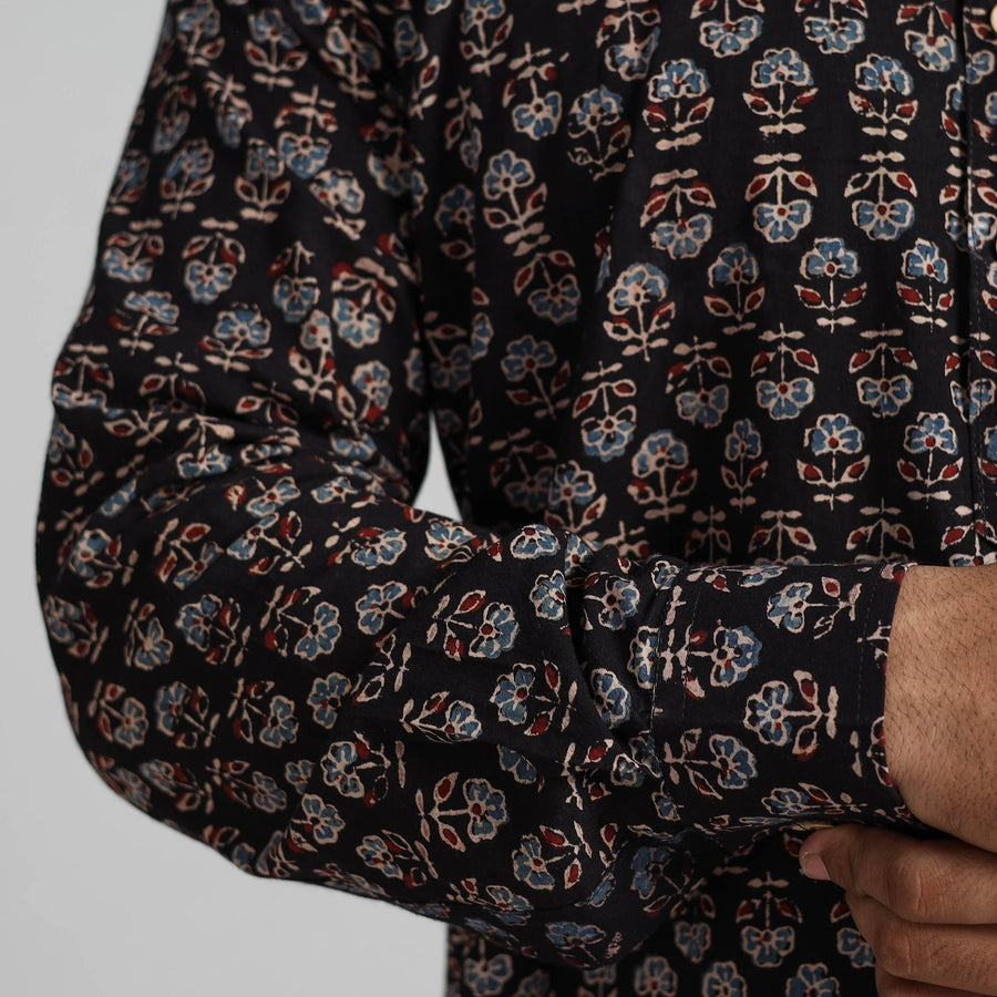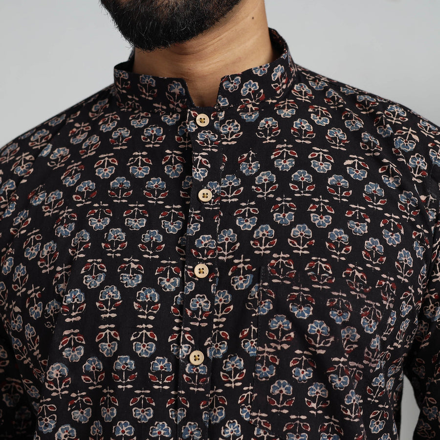 Exquisite ajrakh block-printed cotton men short kurta. Made from ajrakh block-printed natural dyes cotton fabric, it has full sleeves, a front button placket with a Chinese collar, and a patch pocket on the front.