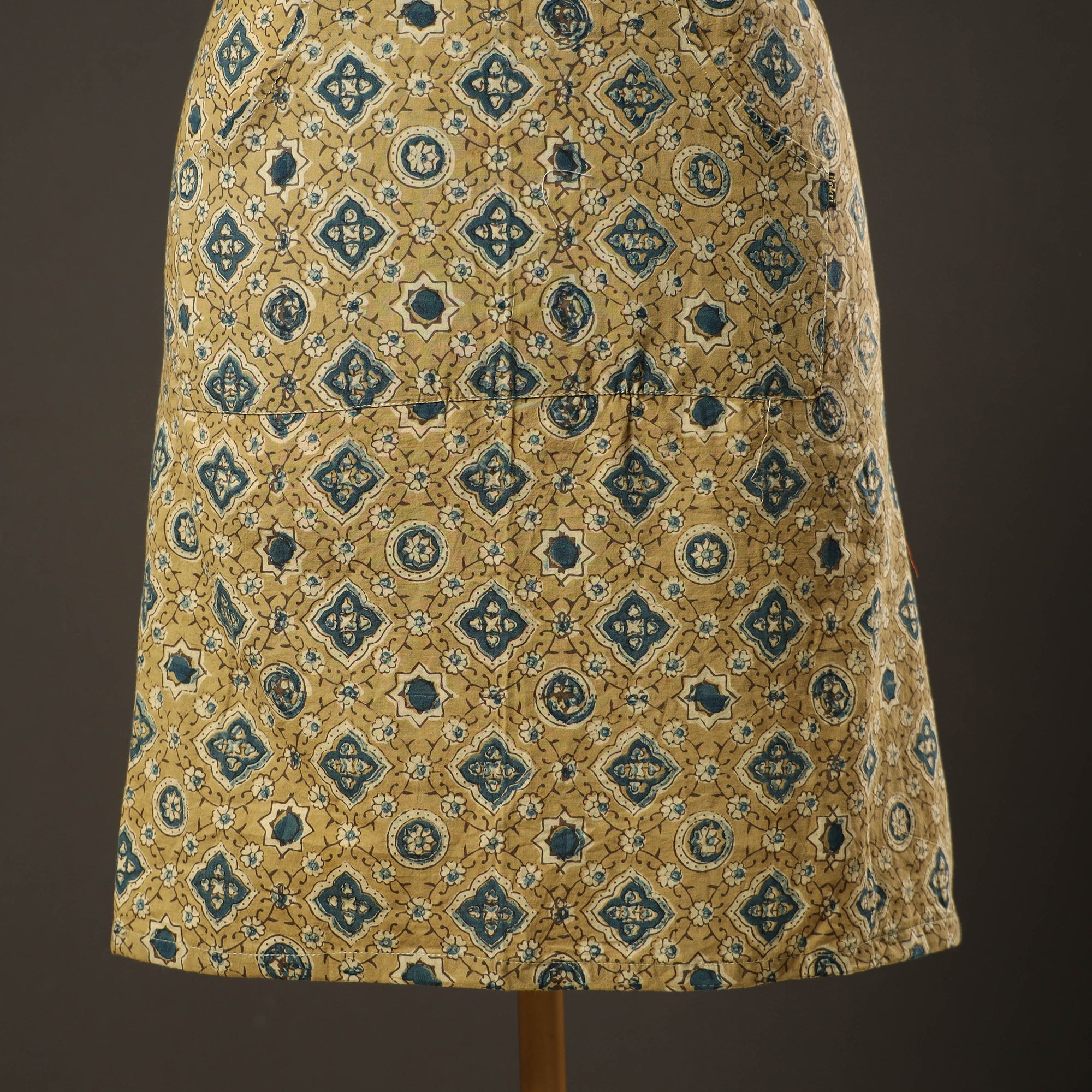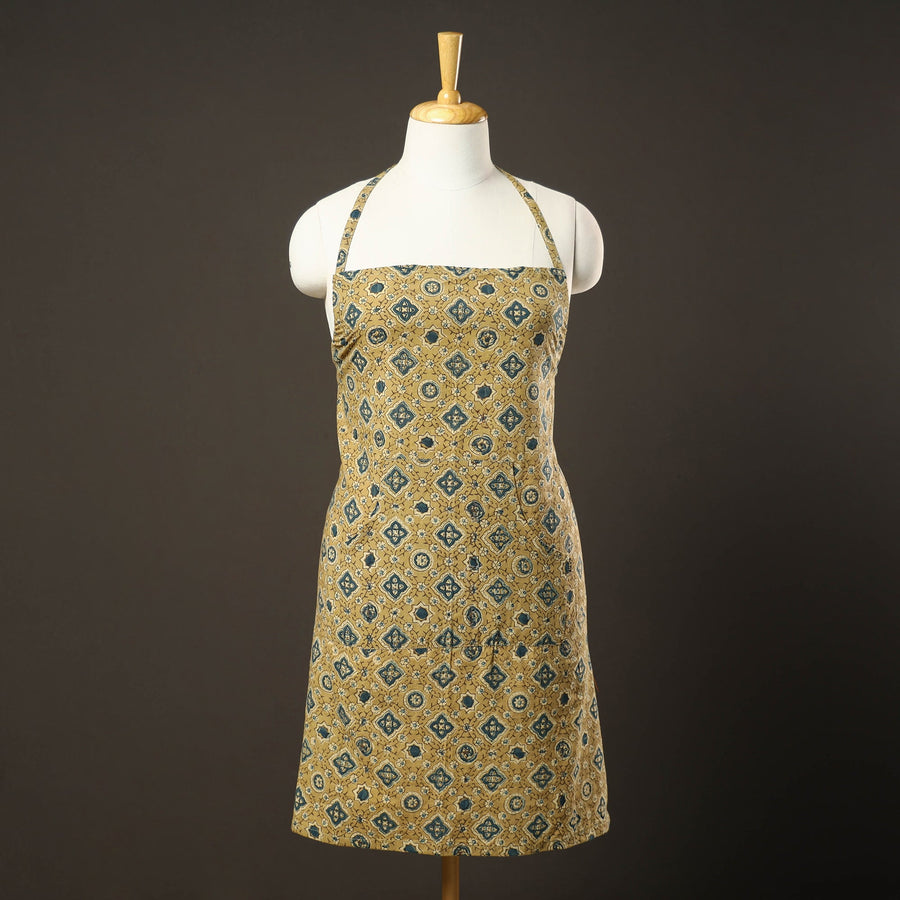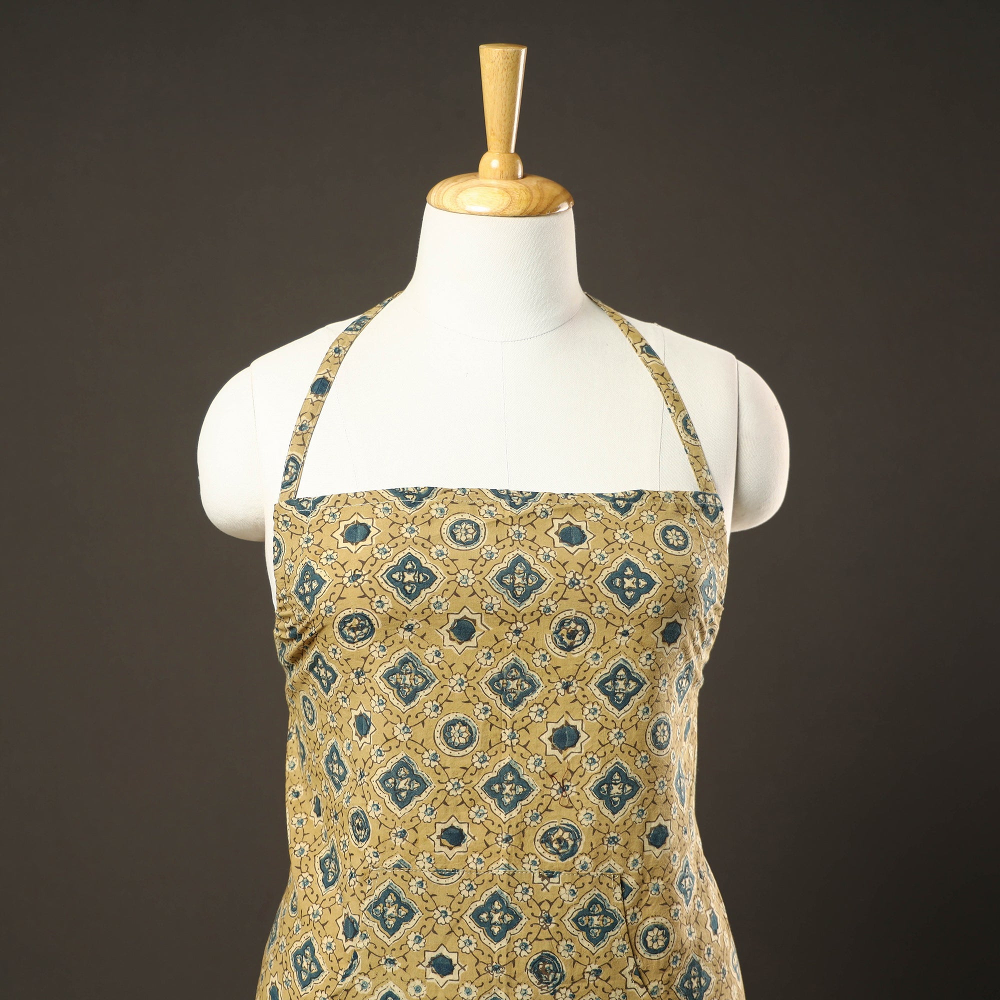 This yellow ajrakh block-printed cotton apron with pocket is a versatile and stylish addition to your cooking and baking ensemble! This apron is perfect for protecting your clothing from splatters and spills while you work in the kitchen. With a convenient pocket at the front, this apron allows you to keep all your essential kitchen tools close at hand. The adjustable neck strap and waist ties ensure a comfortable and secure fit for all body types, making this apron suitable for both men and women.