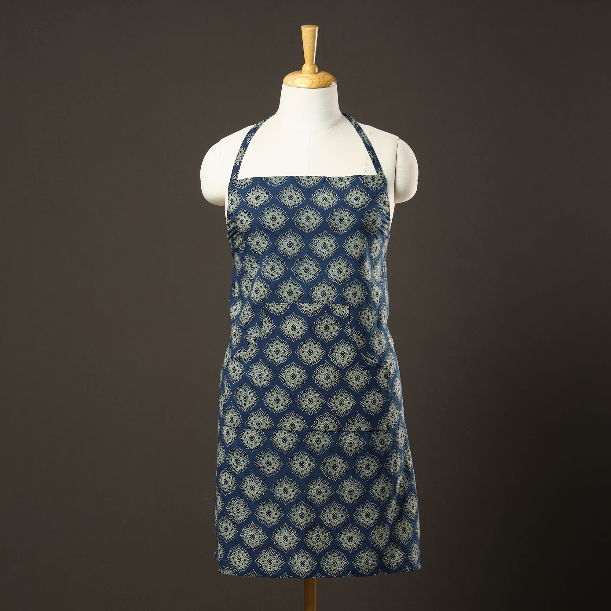 | Material | This blue ajrakh block-printed cotton apron with pocket is a versatile and stylish addition to your cooking and baking ensemble! This apron is perfect for protecting your clothing from splatters and spills while you work in the kitchen. With a convenient pocket at the front, this apron allows you to keep all your essential kitchen tools close at hand. The adjustable neck strap and waist ties ensure a comfortable and secure fit for all body types, making this apron suitable for both men and women. |