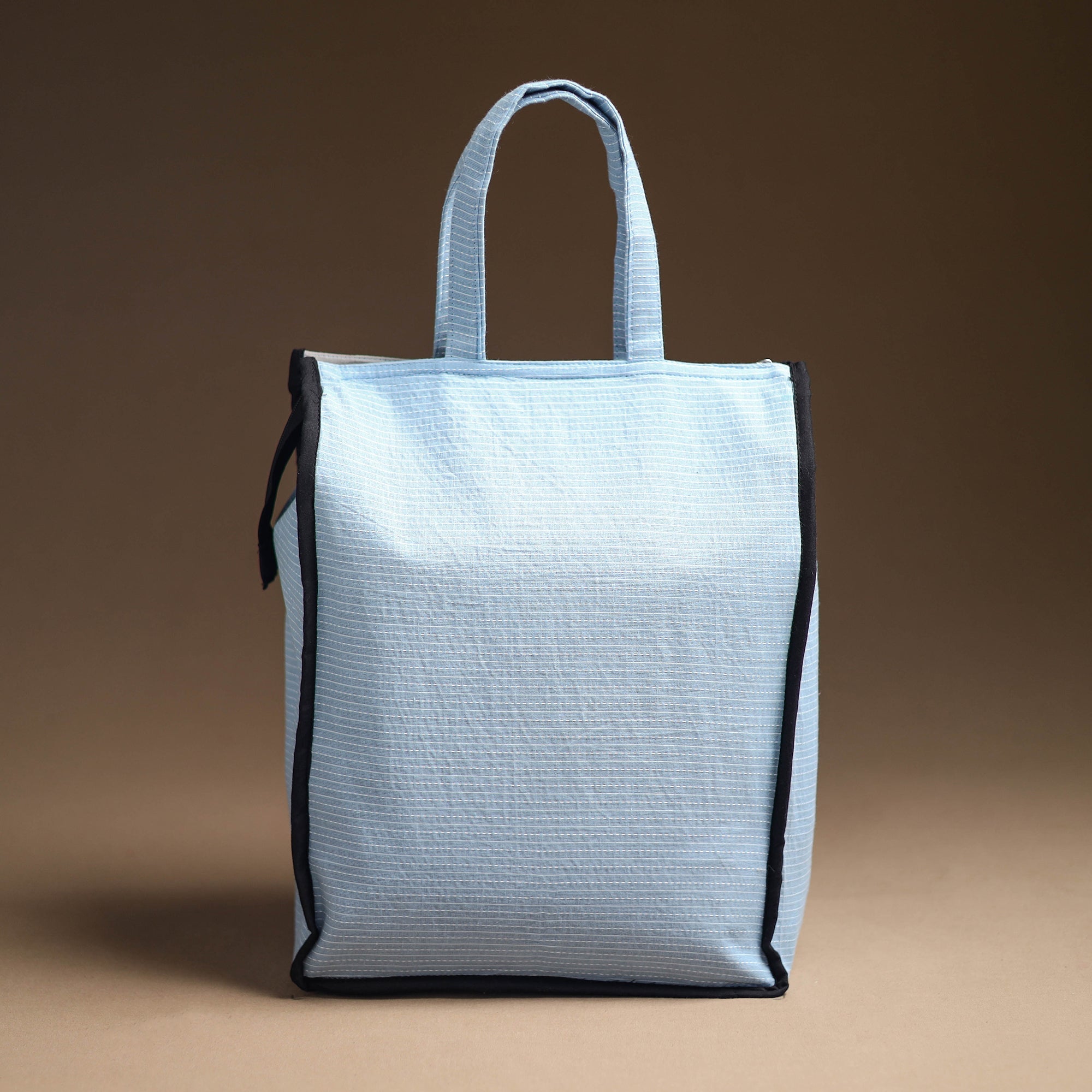 Enhance your shopping routine with our blue handcrafted cotton shopping bag. Textured with handmade textiles from India, it is a convenient, stylish, and sustainable companion for your daily shopping, and it has enough space to accommodate most of the items. It also has one zipper pocket outside.