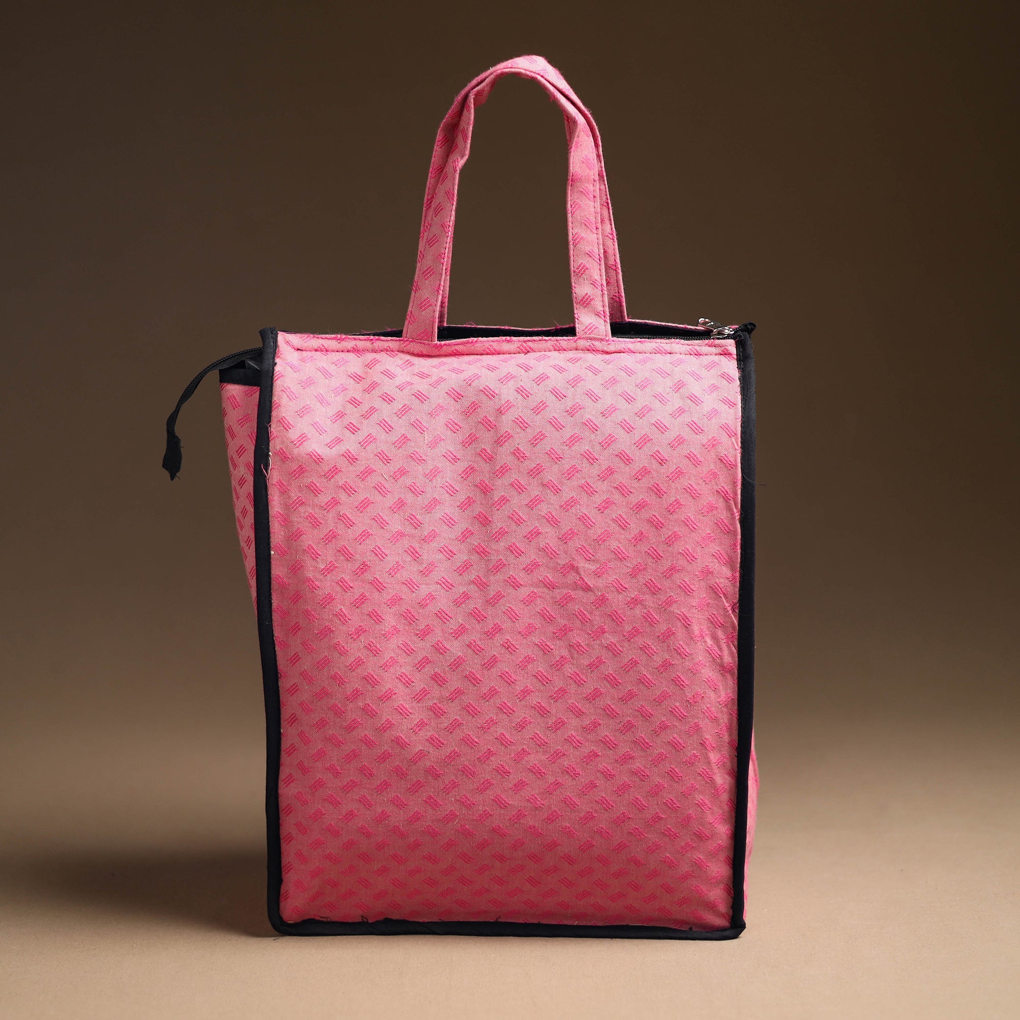 Enhance your shopping routine with our pink handcrafted cotton shopping bag. Textured with handmade textiles from India, it is a convenient, stylish, and sustainable companion for your daily shopping, and it has enough space to accommodate most of the items. It also has one zipper pocket outside.