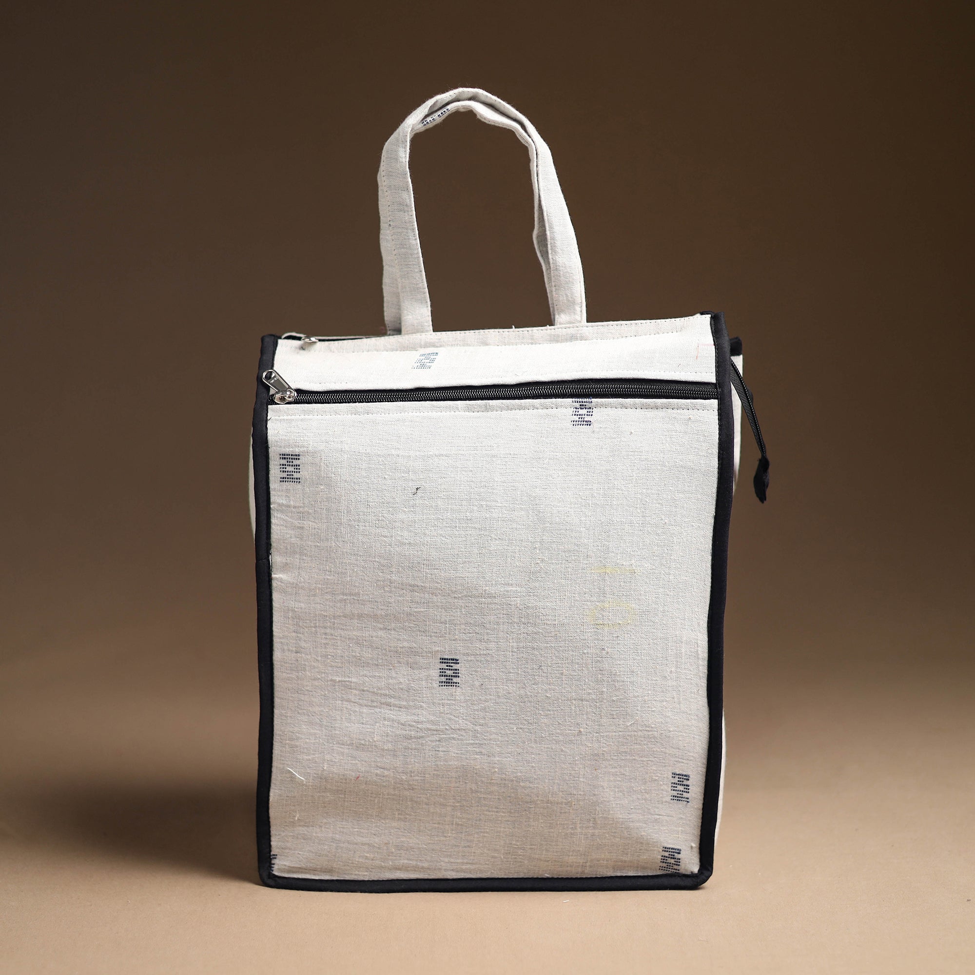 Enhance your shopping routine with our white handcrafted cotton shopping bag. Textured with handmade textiles from India, it is a convenient, stylish, and sustainable companion for your daily shopping, and it has enough space to accommodate most of the items. It also has one zipper pocket outside.