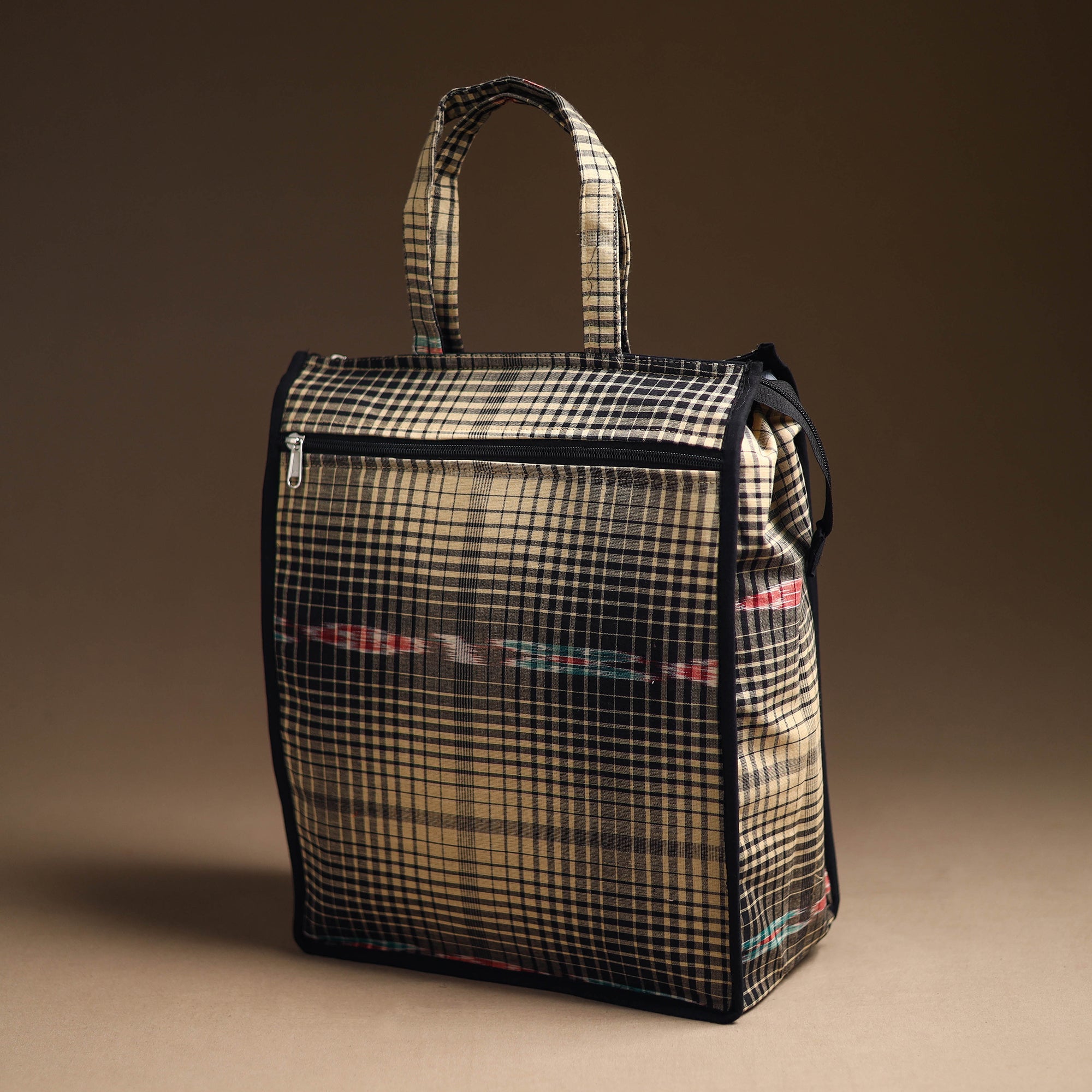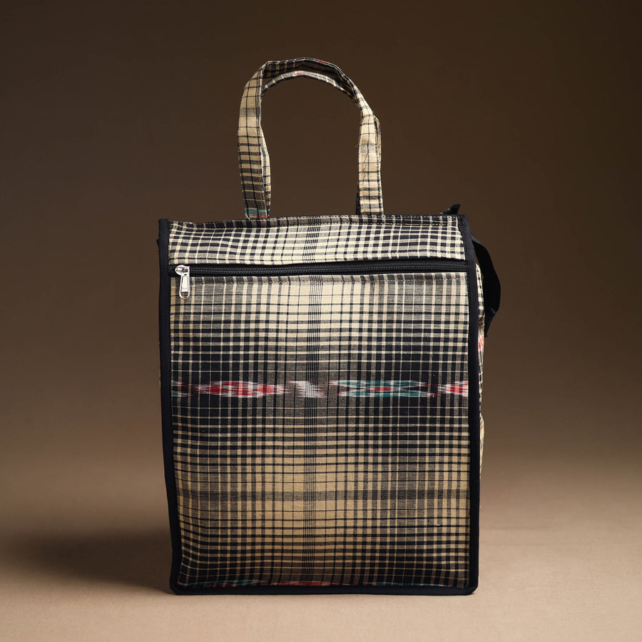 Enhance your shopping routine with our black handcrafted cotton shopping bag. Textured with handmade textiles from India, it is a convenient, stylish, and sustainable companion for your daily shopping, and it has enough space to accommodate most of the items. It also has one zipper pocket outside.