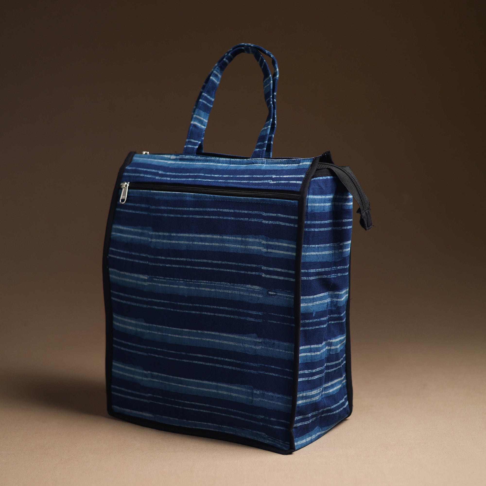 Enhance your shopping routine with our blue handcrafted cotton shopping bag. Textured with handmade textiles from India, it is a convenient, stylish, and sustainable companion for your daily shopping, and it has enough space to accommodate most of the items. It also has one zipper pocket outside.