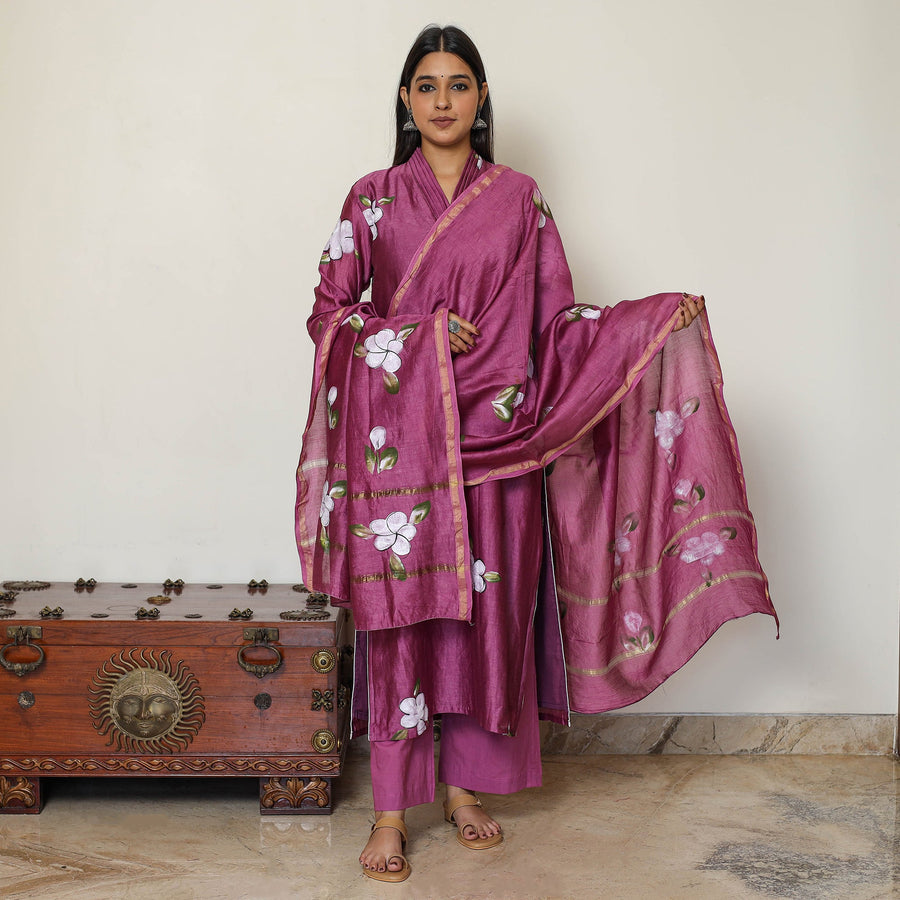 Elevate your style with this exquisite hand-painted chanderi silk cotton suit set from Rajasthan. This set includes a beautifully hand-painted chanderi silk cotton kurta, a matching dupatta, and a plain cotton bottom. This suit material uses azo-free dyes, making it safe and non-harmful for the skin.