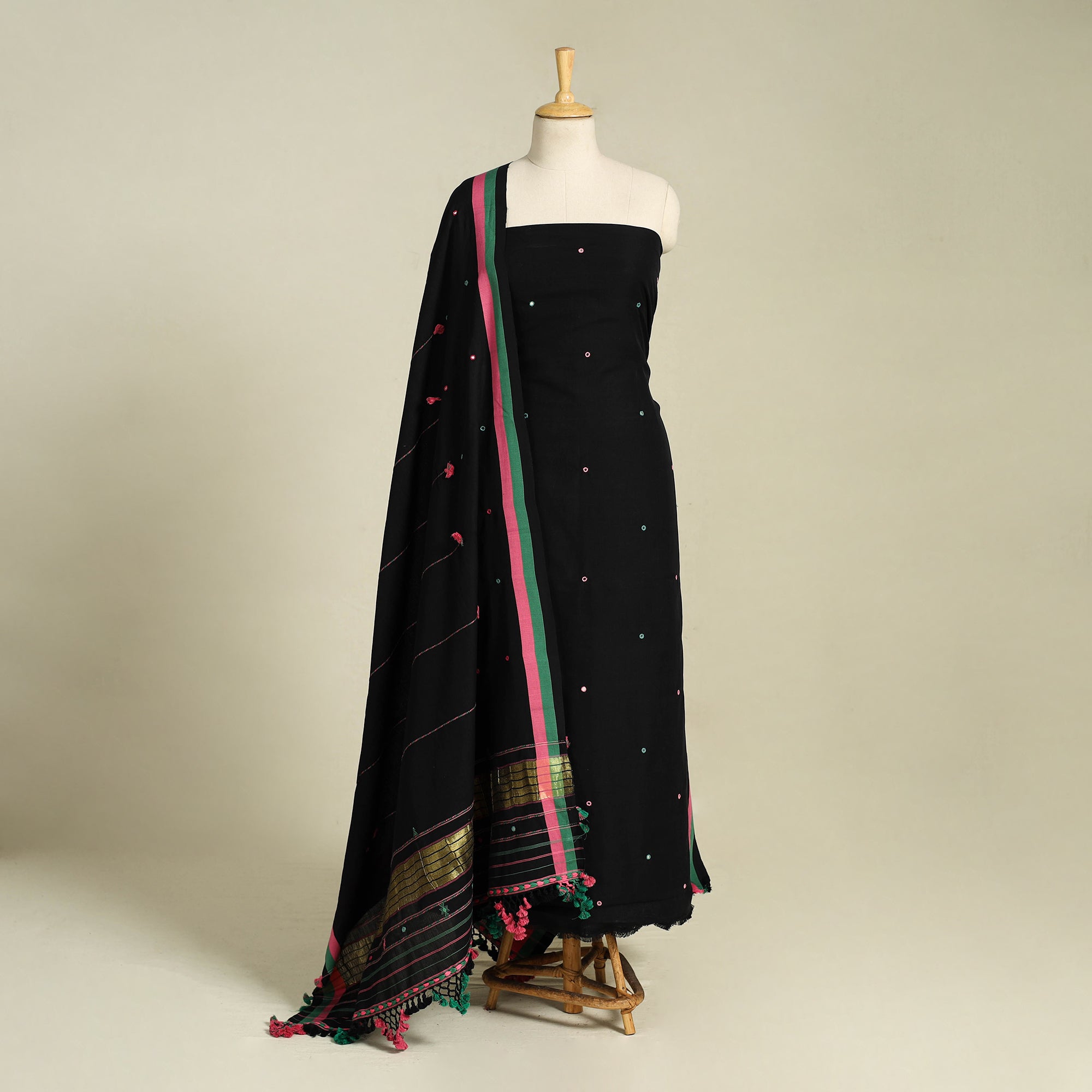 This exquisite kutch black bhujodi weaving mirror work handloom cotton 3-piece suit material set is made by the skilled artisans from the village of Bhujodi in Kutch. This set is crafted using cotton fibers with azo-free dye colors. The kutch bhujodi weaving technique is employed to create this set. The intricate mirror work and handloom finesse showcase traditional artistry.