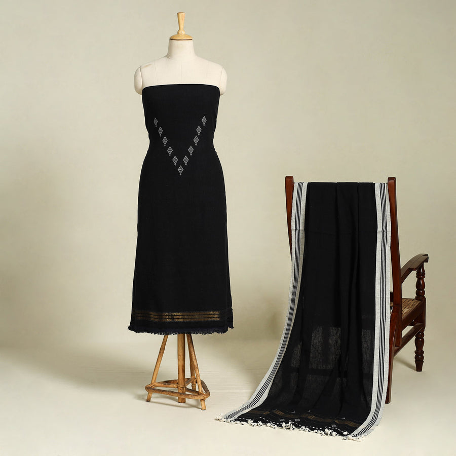 This exquisite kutch weaving black handloom organic kala cotton 3-piece suit material set is made by the skilled artisans of Kutch, Gujarat. This set is crafted using 100% certified organic cotton fibers with azo-free dye colors. The kutch handloom weaving technique is employed to create this exquisite set.