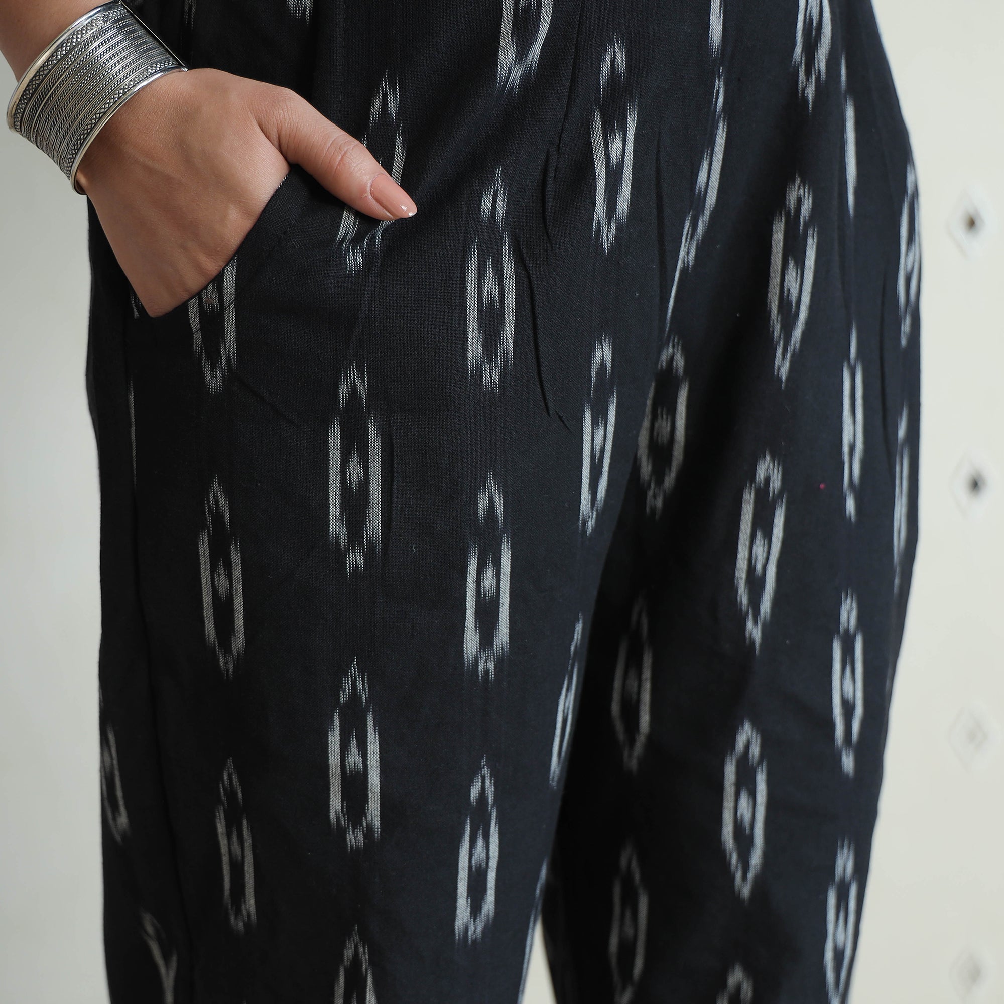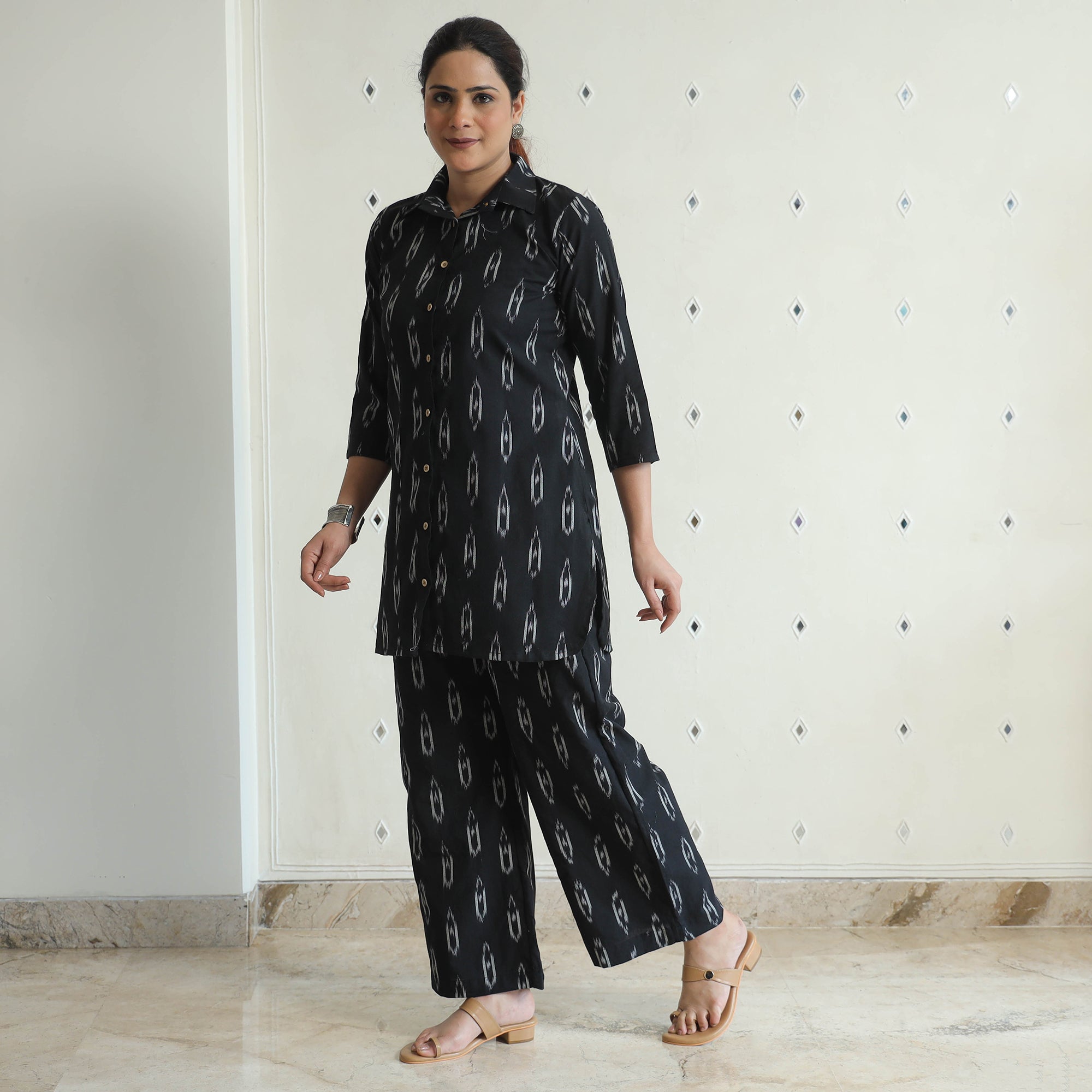 Stay comfortable and stylish in this cotton top and palazzo co-ord set. Made from pochampally ikat cotton fabric. The elasticized waist palazzo ensures a great fit, while the two side pockets adds functionality to this palazzo. The unique design ensures a beautiful and comfortable fit.