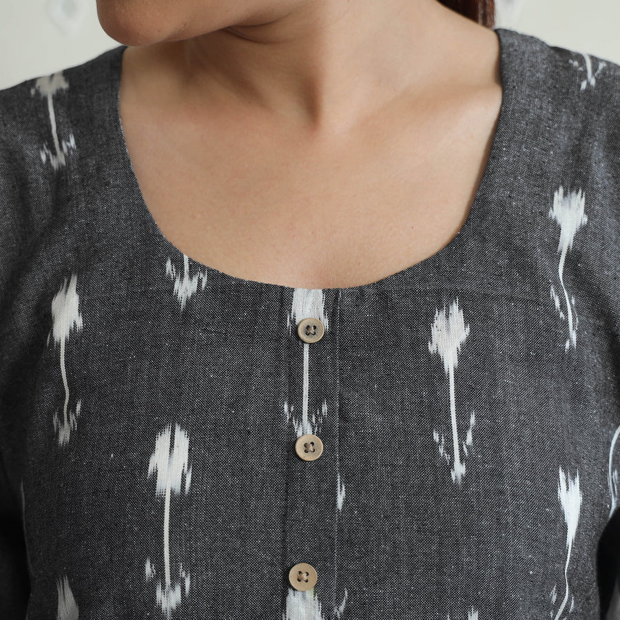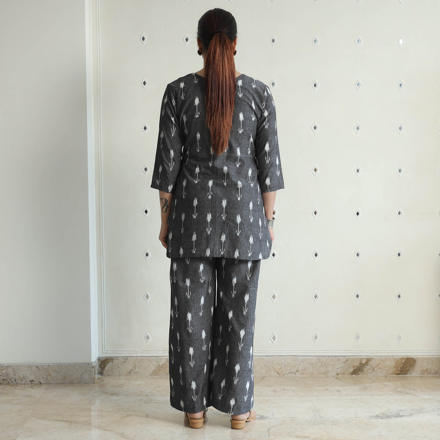 Stay comfortable and stylish in this cotton top and palazzo co-ord set. Made from pochampally ikat cotton fabric. The elasticized waist palazzo ensures a great fit, while the two side pockets adds functionality to this palazzo. The unique design ensures a beautiful and comfortable fit.