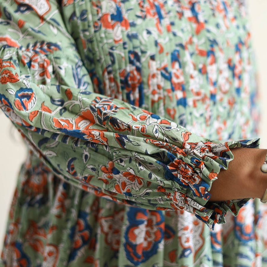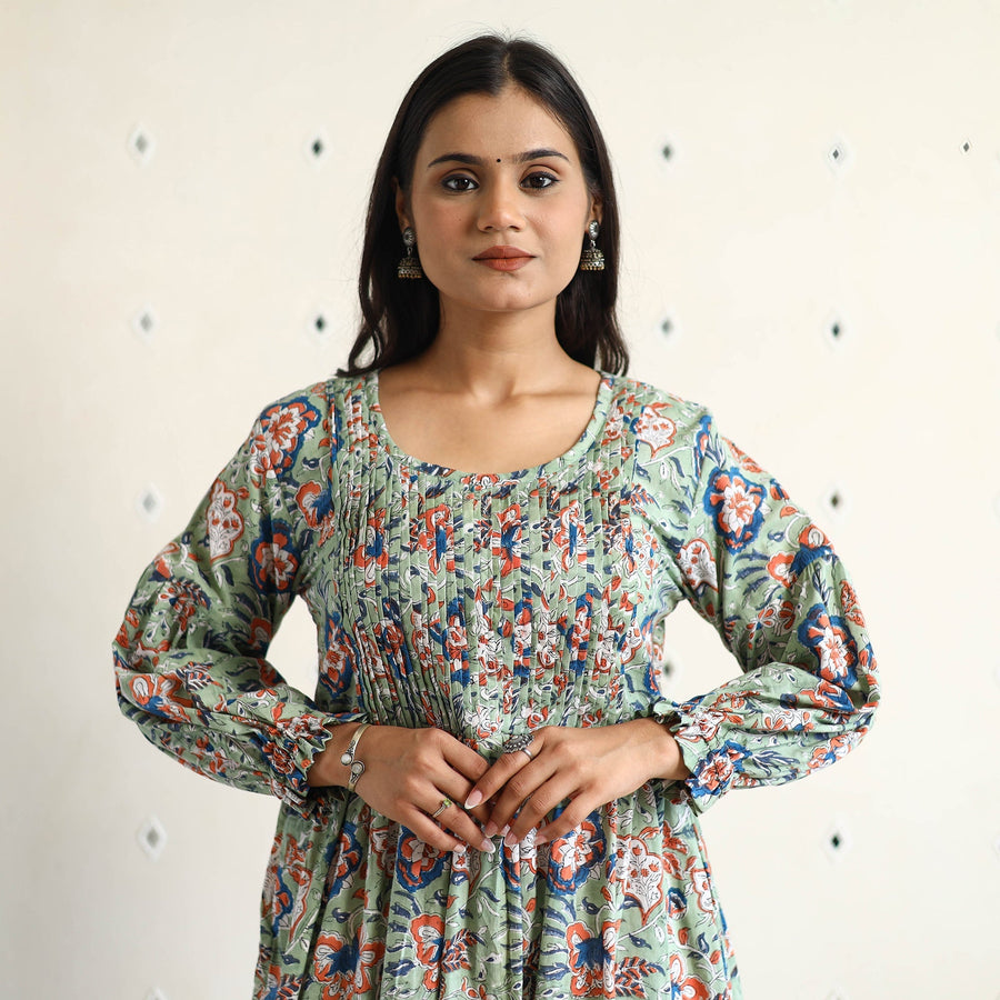 Green - Sanganeri Block Printed Cotton Pintuck Flared Dress 13