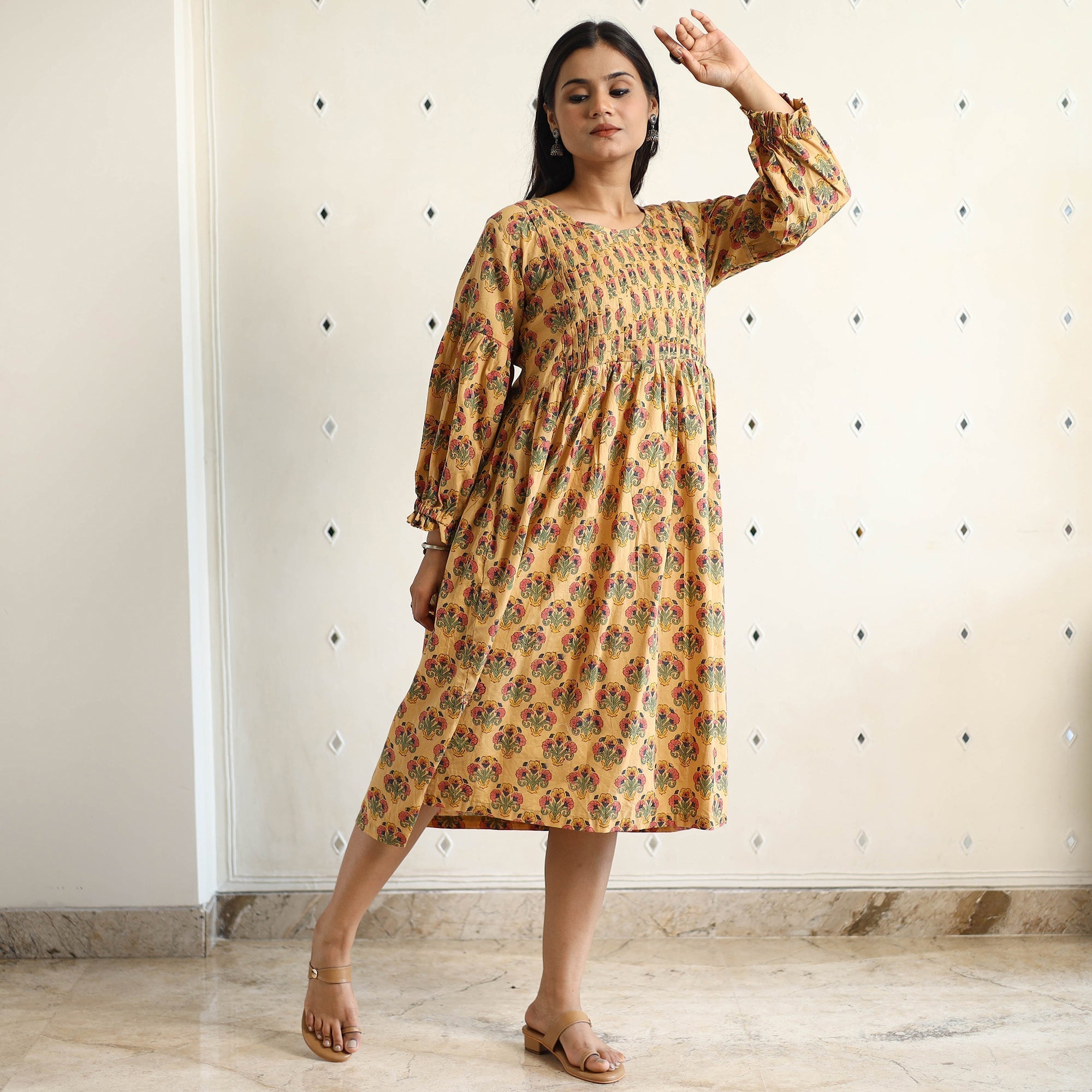 | Material | Indulge in the timeless charm of this sanganeri block-printed cotton pintuck flared dress, thoughtfully designed to enhance your style. This dress is crafted from cotton fabric, ensuring a comfortable feel against your skin. This dress features intricate block prints, reflecting the rich heritage and cultural motifs of the region. perfect for your daily outing and for a special occasion. |
