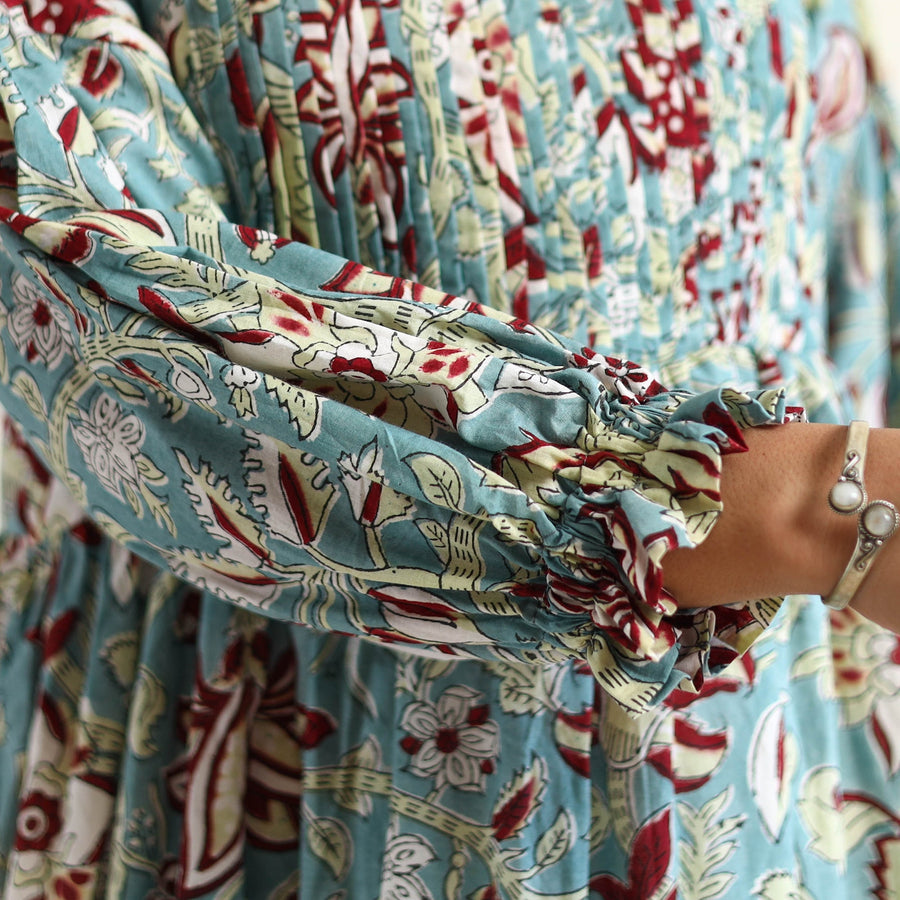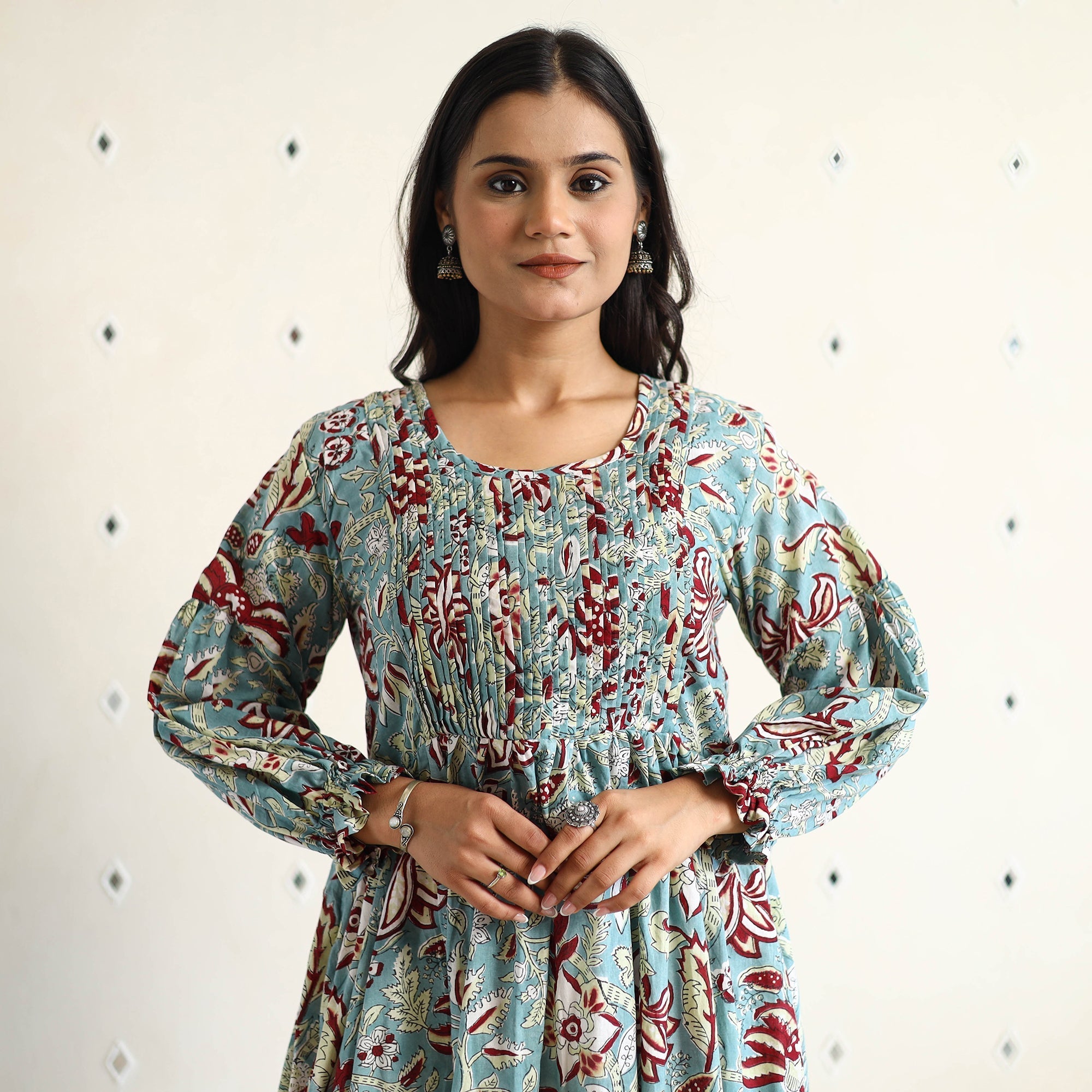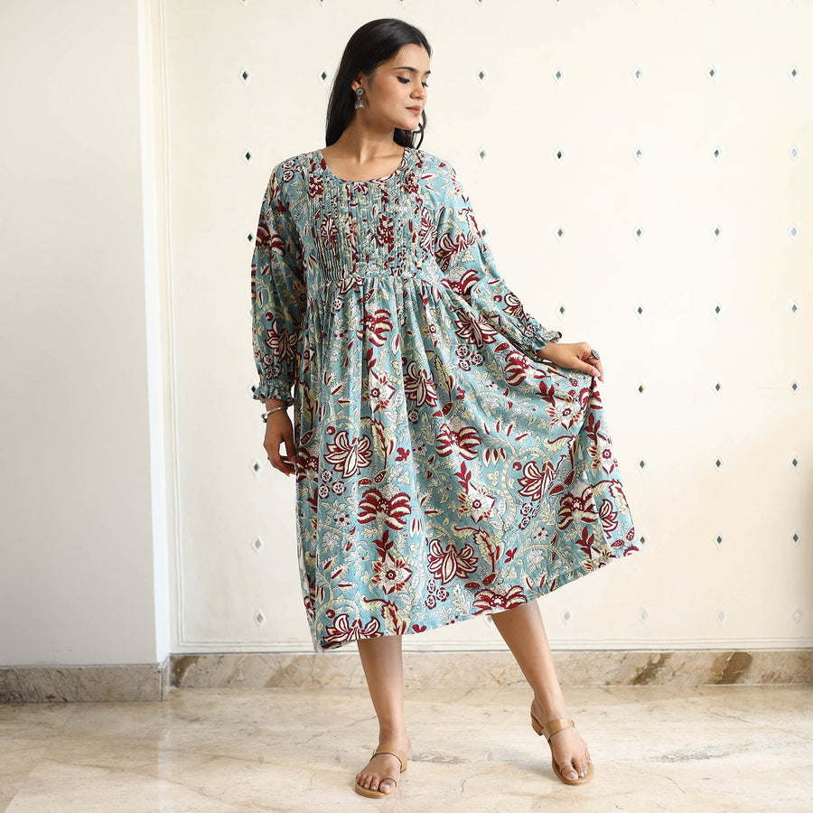 Material Indulge in the timeless charm of this sanganeri block-printed cotton pintuck flared dress, thoughtfully designed to enhance your style. This dress is crafted from cotton fabric, ensuring a comfortable feel against your skin. This dress features intricate block prints, reflecting the rich heritage and cultural motifs of the region. perfect for your daily outing and for a special occasion.