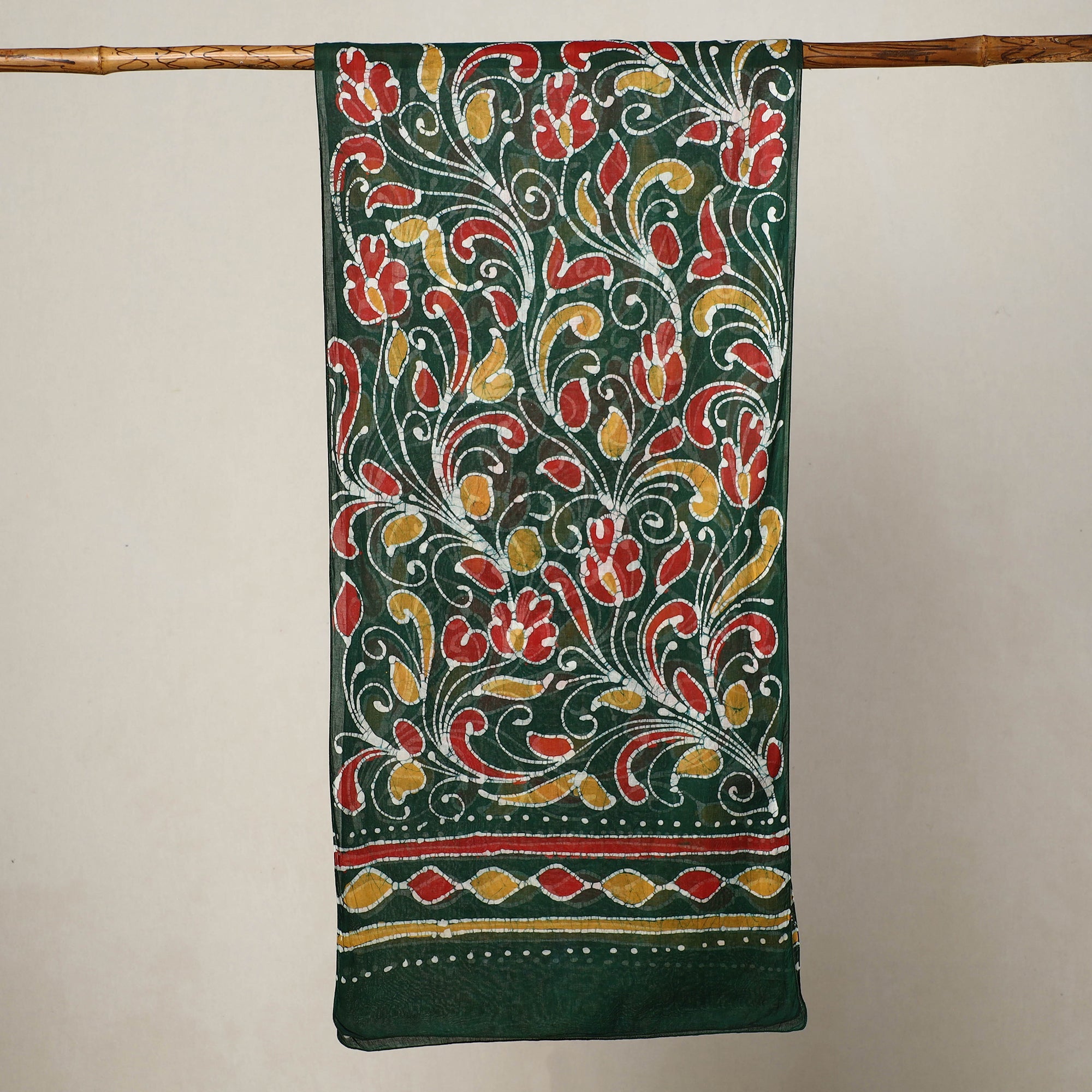 Fine quality green hand batik printed mul cottonstole from Ujjain, Madhya Pradesh.Batik is a technique of wax-resist dyeing applied to whole cloth, or cloth made using this technique. The traditional designs and motifs in Indian batik are often passed down from one generation to another.