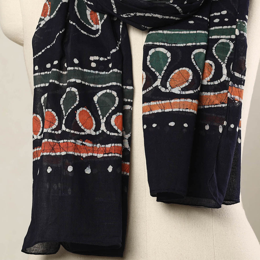 Fine quality black hand batik printed mul cottonstole from Ujjain, Madhya Pradesh.Batik is a technique of wax-resist dyeing applied to whole cloth, or cloth made using this technique. The traditional designs and motifs in Indian batik are often passed down from one generation to another.