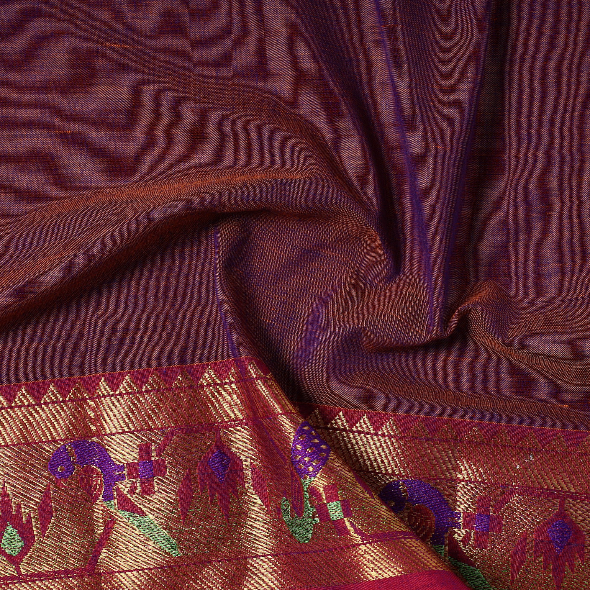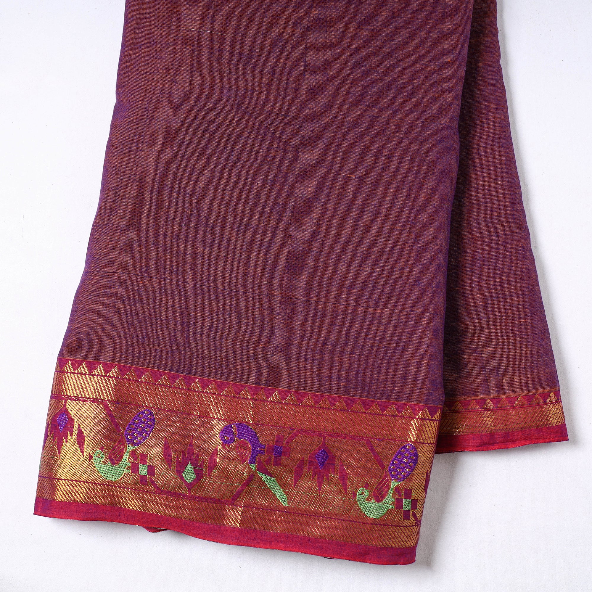 Embrace the elegance of Purple Dharwad mercerised cotton fabric with a traditional zari-woven border from Dharwad, Karnataka. This prewashed fabric offers a fine texture and luxurious feel, making it perfect for crafting unique garments, home decor, and creative projects. India’s rich textile tradition, this fabric reflects the artistry of Dharwad’s skilled weavers.