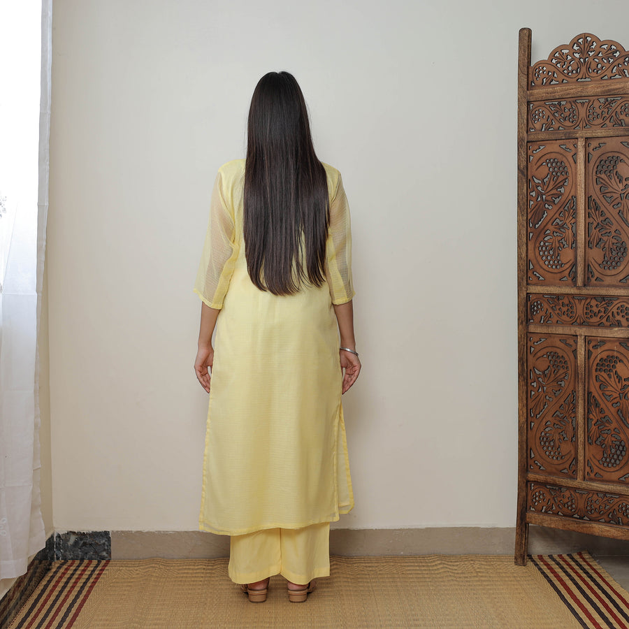 Experience the grace and lightness of our 3-piece Kota Doria cotton-embroidered suit set, perfect for every occasion. Crafted from a blend of cotton and lustrous silk yarns, this suit set features a kurta and dupatta with delicate embroidery, paired with a plain cotton bottom. Kota Doria, known for its sheer texture and exquisite craftsmanship, brings an airy elegance to your wardrobe.