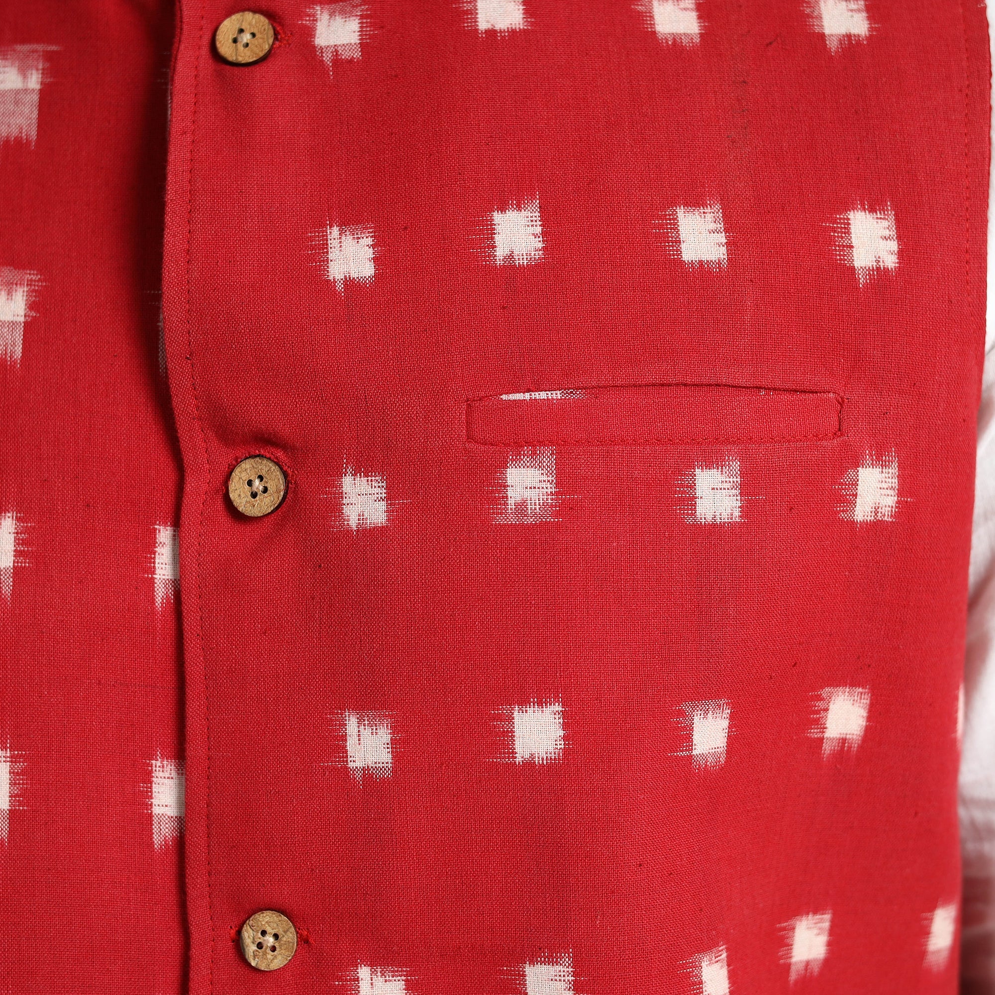 Elevate your wardrobe with our pochampally double ikat handloom cotton men nehru jacket. Made with precision, this sleeveless jacket embodies the timeless art of pochampally weaving, blending intricate patterns with modern elegance. The chinese collar and functional outer pockets add sophistication and convenience. This jacket isn’t just a fashion statement; it’s a piece of India’s rich textile heritage.