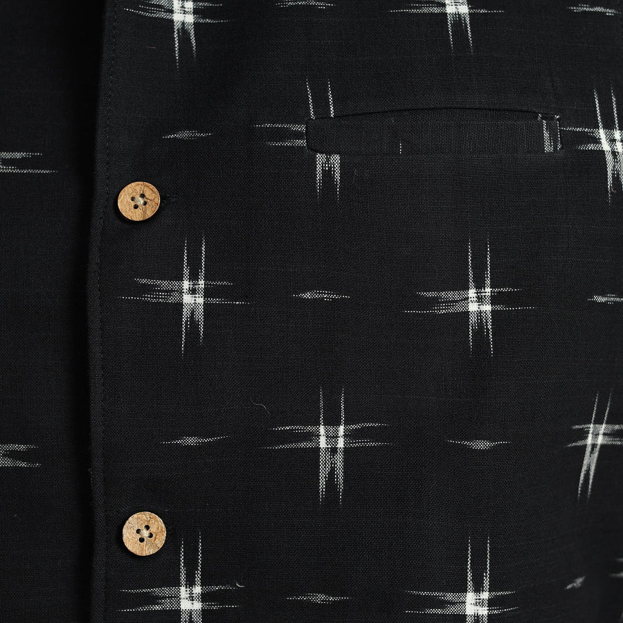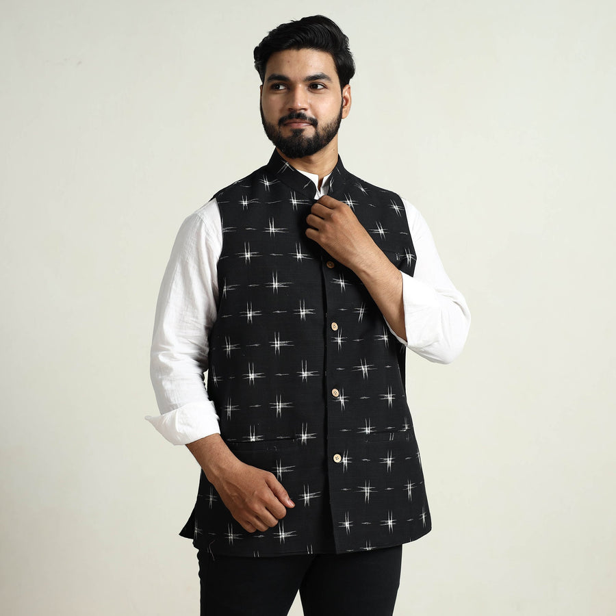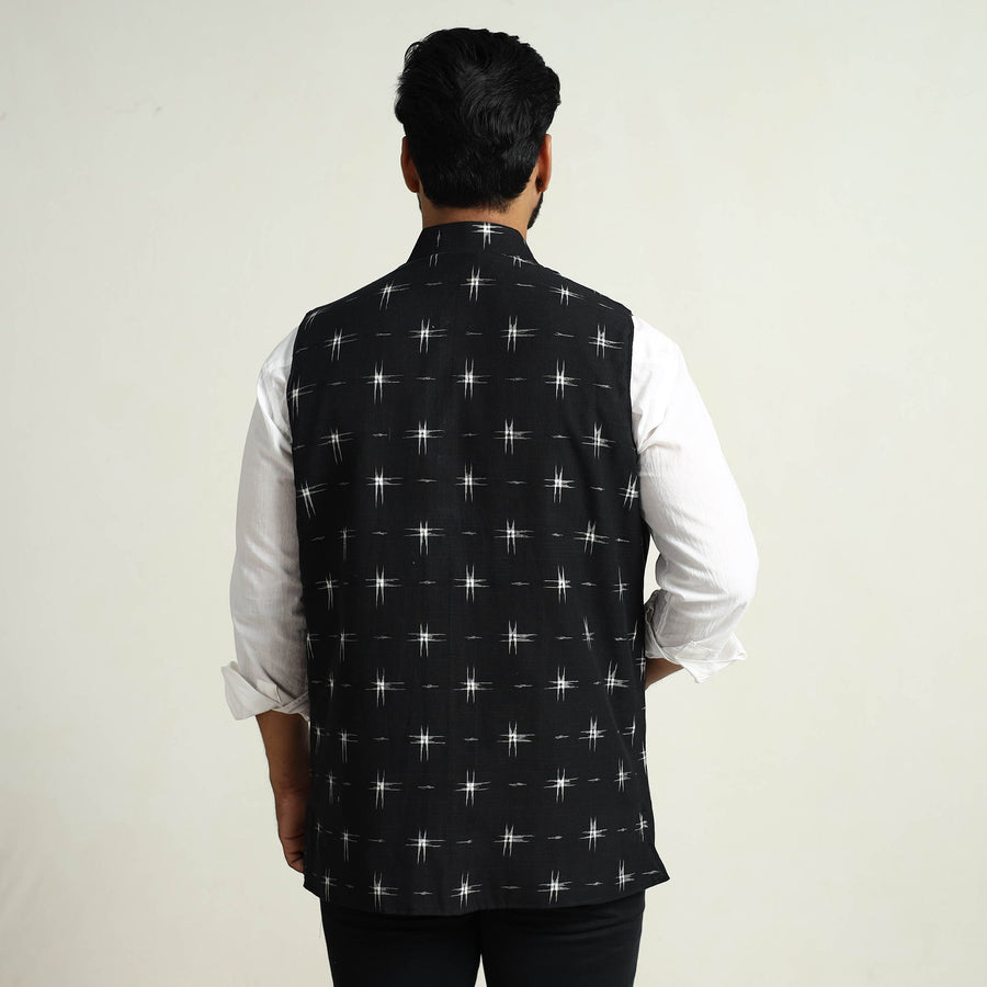 Elevate your wardrobe with our pochampally double ikat handloom cotton men nehru jacket. Made with precision, this sleeveless jacket embodies the timeless art of pochampally weaving, blending intricate patterns with modern elegance. The chinese collar and functional outer pockets add sophistication and convenience. This jacket isn’t just a fashion statement; it’s a piece of India’s rich textile heritage.