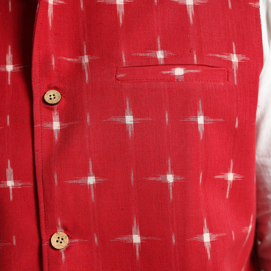 Elevate your wardrobe with our pochampally double ikat handloom cotton men nehru jacket. Made with precision, this sleeveless jacket embodies the timeless art of pochampally weaving, blending intricate patterns with modern elegance. The chinese collar and functional outer pockets add sophistication and convenience. This jacket isn’t just a fashion statement; it’s a piece of India’s rich textile heritage.