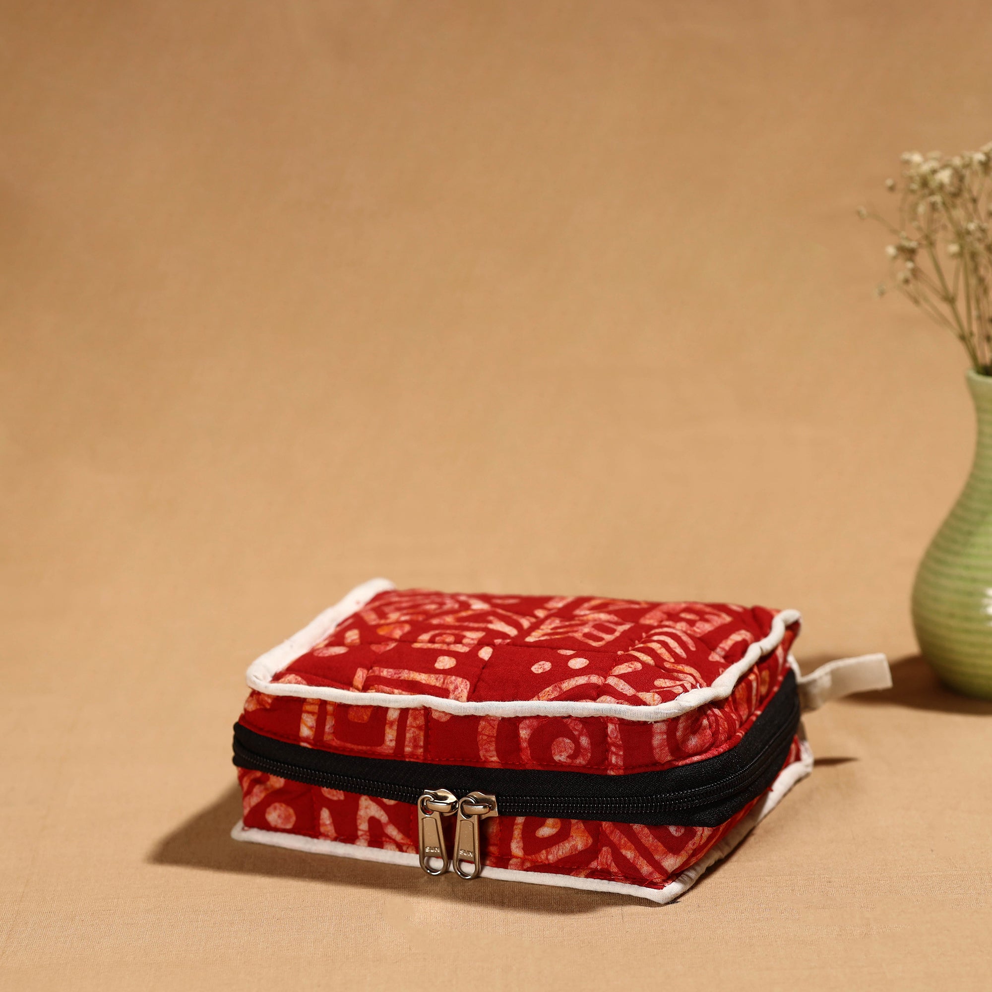 | Material | Introducing our red handmade 4-pocket cotton jewelry bag, an eco-friendly solution crafted by skilled artisans. This bag offers ample space to organize your precious jewelry, with four spacious pockets and a soft cotton texture. |