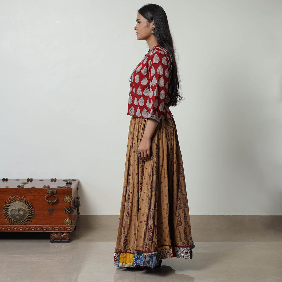 Enhance your ethnic wardrobe with our bagh block printed skirt. This stunning piece, made with the intricate Bagh printing technique from Madhya Pradesh, reflects the rich cultural heritage of India. The patchwork 24 Kali design adds a unique touch, while the waist tie-up ensures a comfortable fit.
