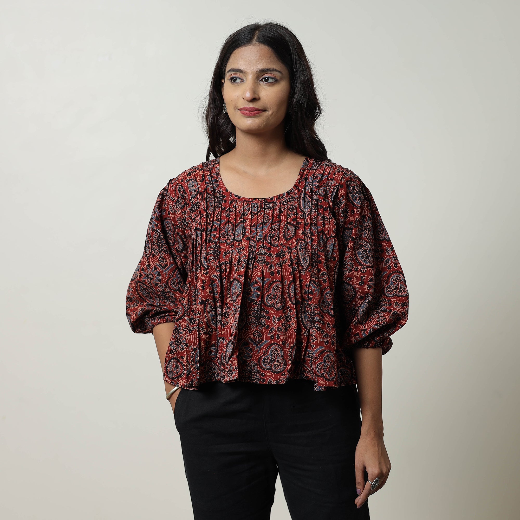 Elevate your wardrobe with this ajrakh block printed cotton crop top, a blend of traditional craftsmanship and modern style. Made from soft, breathable cotton and dyed using natural colors, this top ensures comfort and elegance for any occasion.