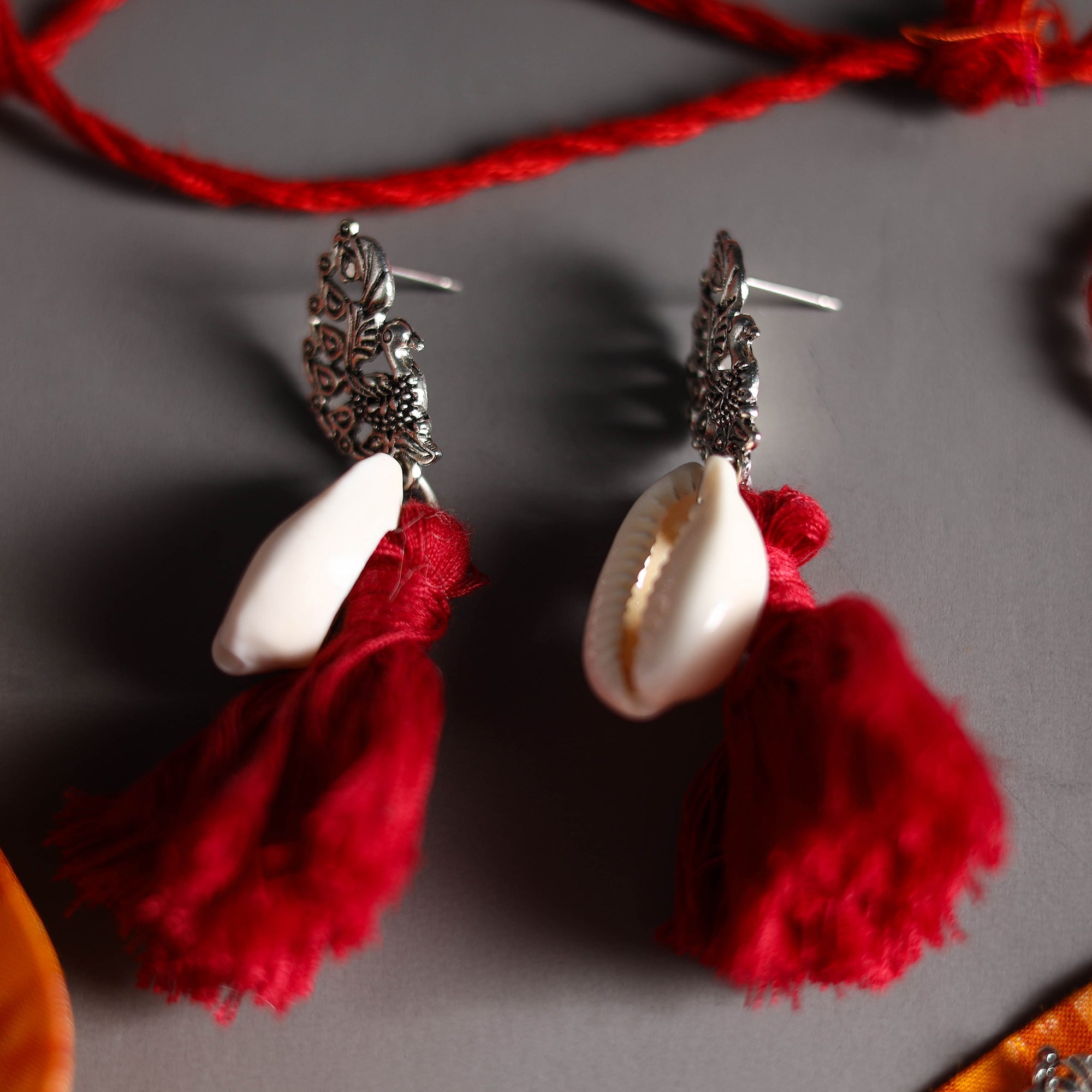 Add a touch of tradition to your jewelry collection with iTokri’s orange handcrafted GS fabart choker necklace set. This exquisite piece is crafted from fabric, featuring detailed german silver, shell, and fine thread work that embodies the rich cultural heritage of Indian artisans. Each necklace is a testament to the skill of our artisans.