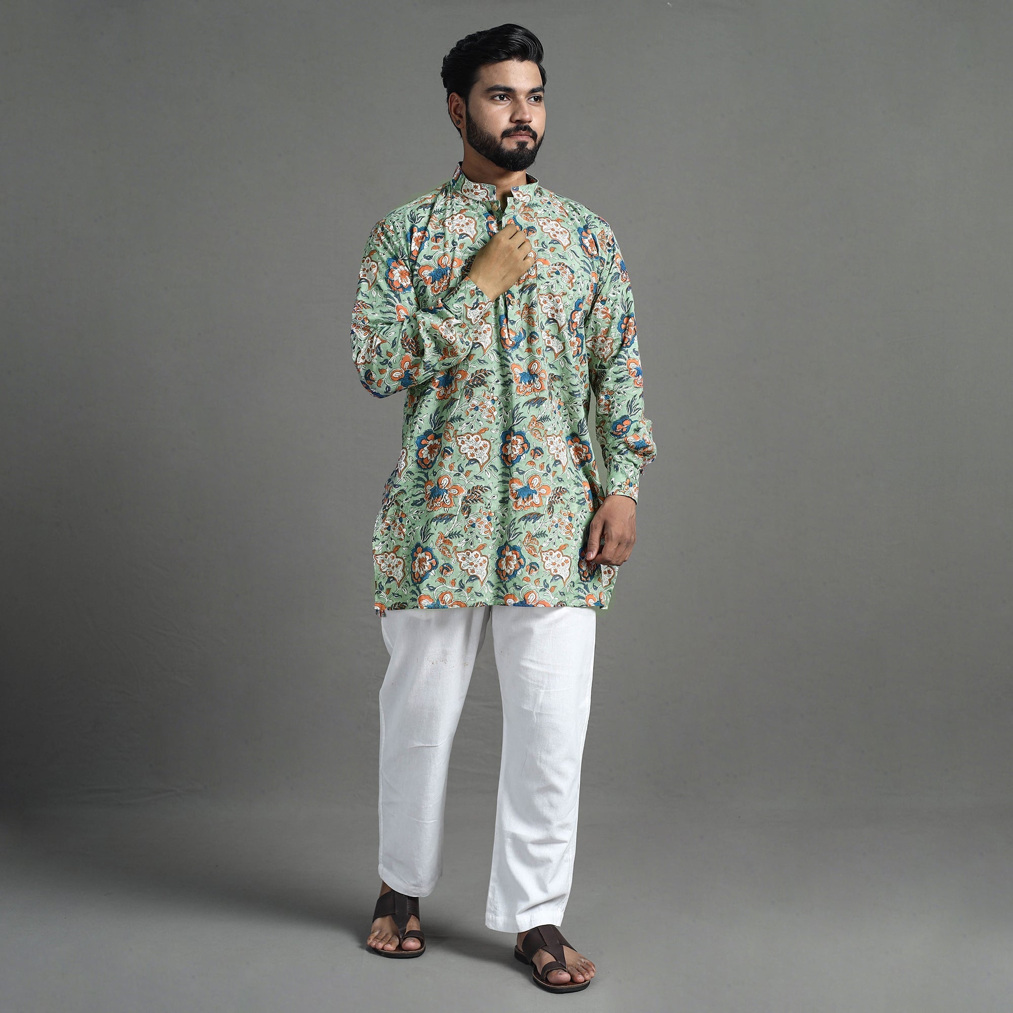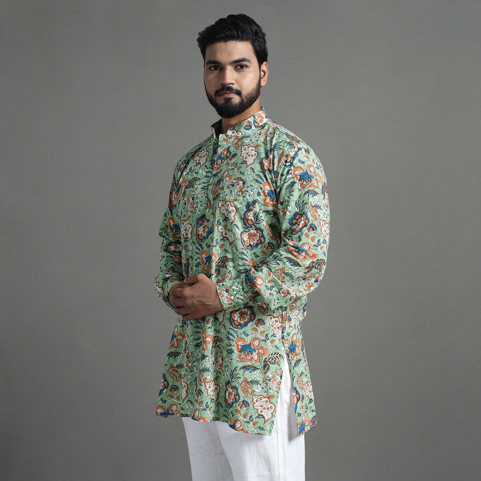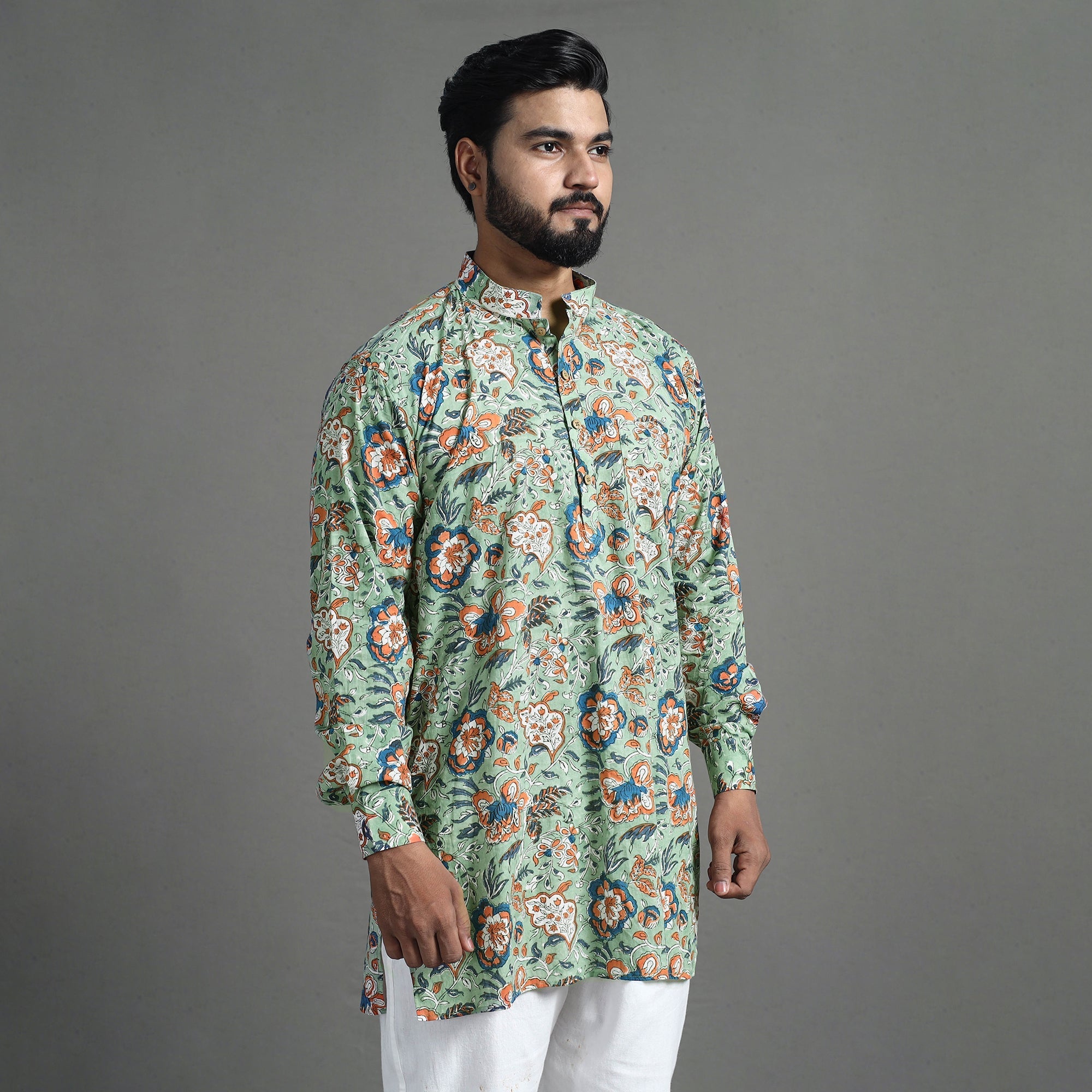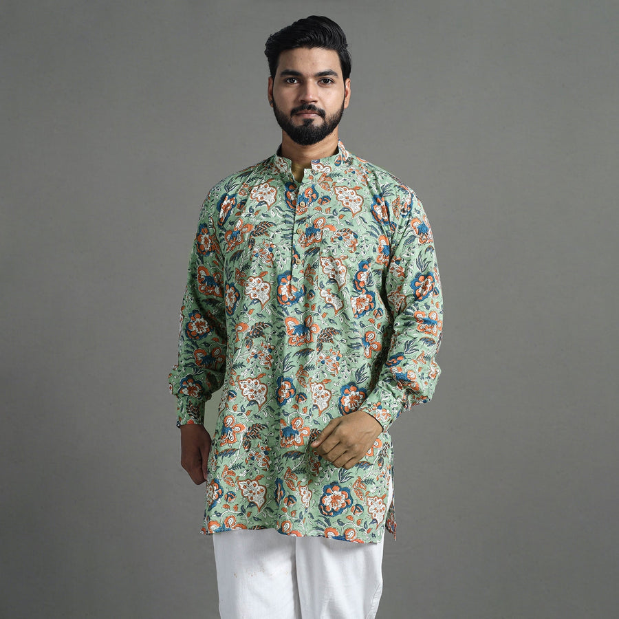 | Material | Experience the rich heritage of sanganeri craftsmanship with our men’s block-printed kurta. Handcrafted from soft, breathable cotton, this short kurta combines traditional artistry with modern comfort. Perfect for daily wear, it features a Chinese collar, full sleeves, and convenient side pockets. |