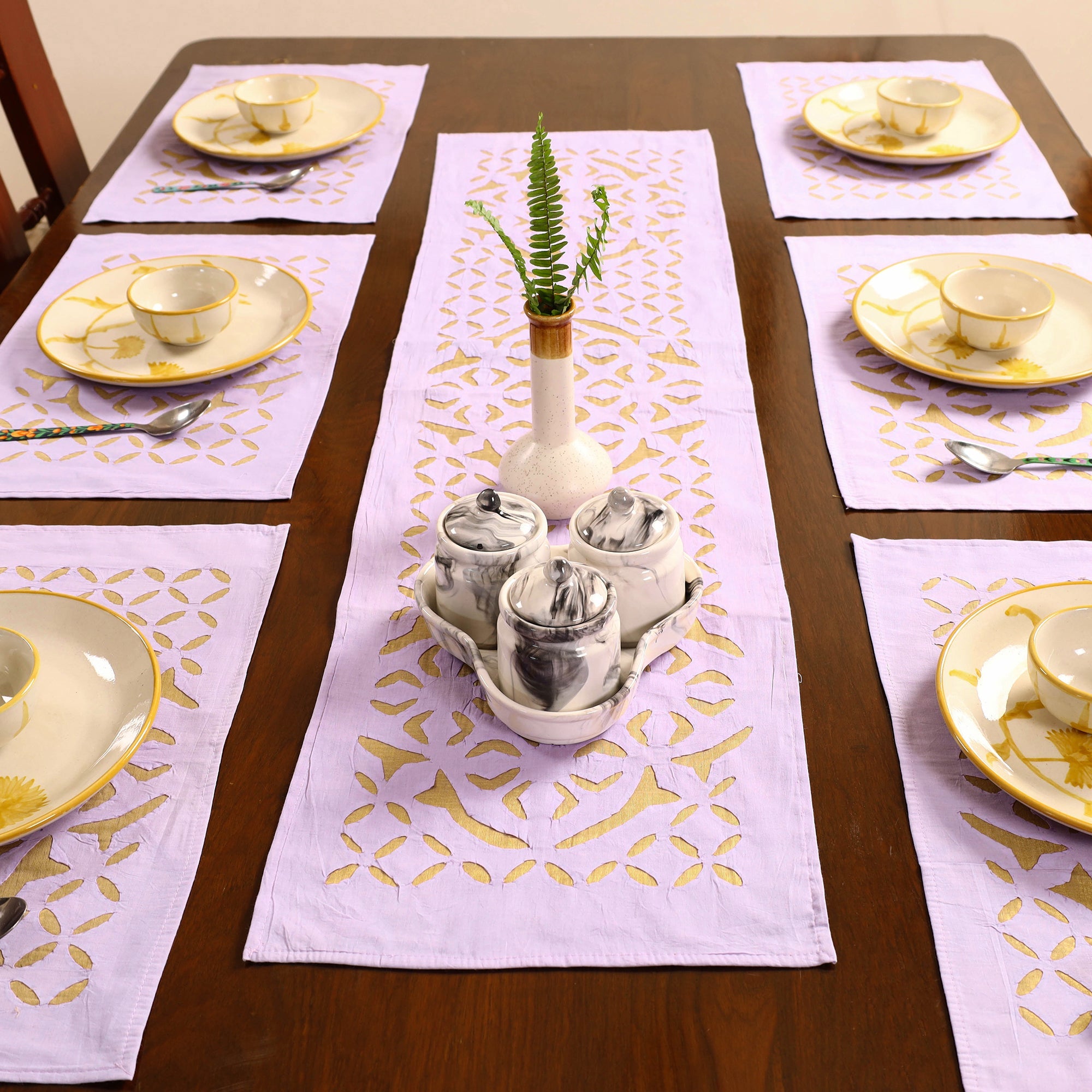 Enhance your dining experience with our exquisite purple applique cut work table runner with table mats. Crafted by skilled artisans from Barmer, Rajasthan, this set features intricate patterns that create a captivating interplay of light and shade. Made from fine quality cotton, it combines elegance with durability. Ideal for making a statement at any gathering, this artisanal piece brings a touch of tradition and sophistication to your home.