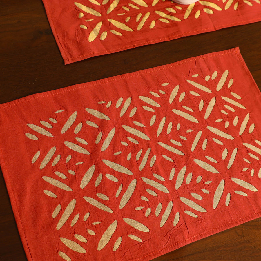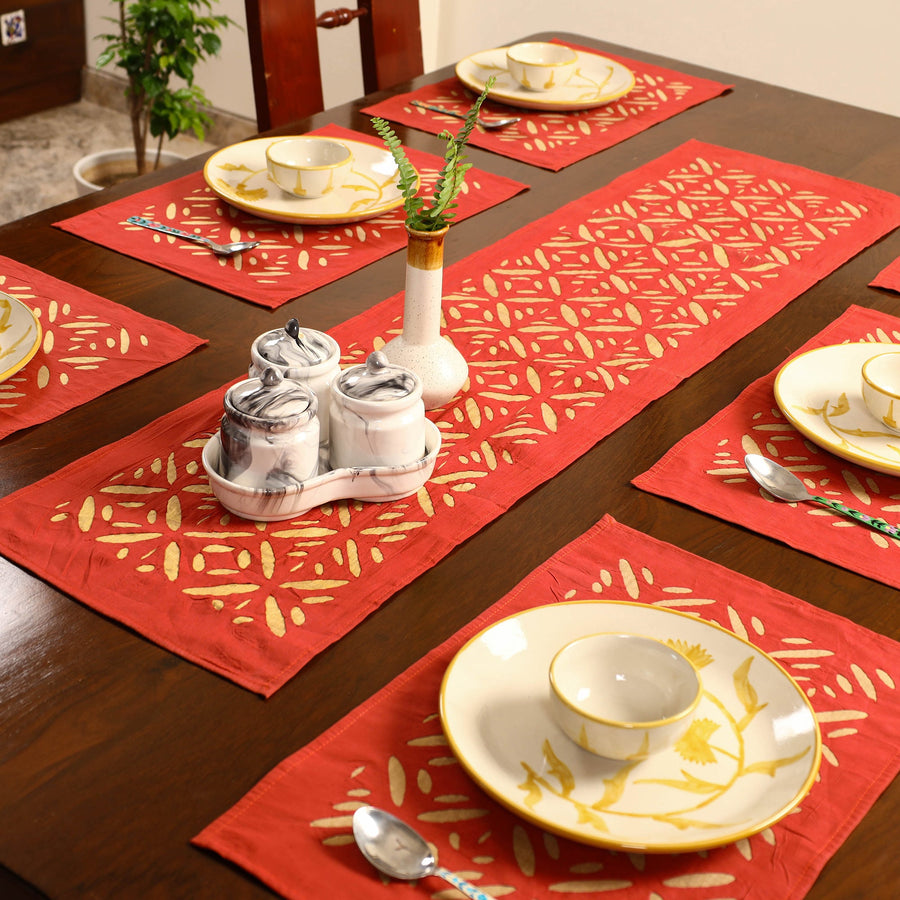 Enhance your dining experience with our exquisite red applique cut work table runner with table mats. Crafted by skilled artisans from Barmer, Rajasthan, this set features intricate patterns that create a captivating interplay of light and shade. Made from fine quality cotton, it combines elegance with durability. Ideal for making a statement at any gathering, this artisanal piece brings a touch of tradition and sophistication to your home.