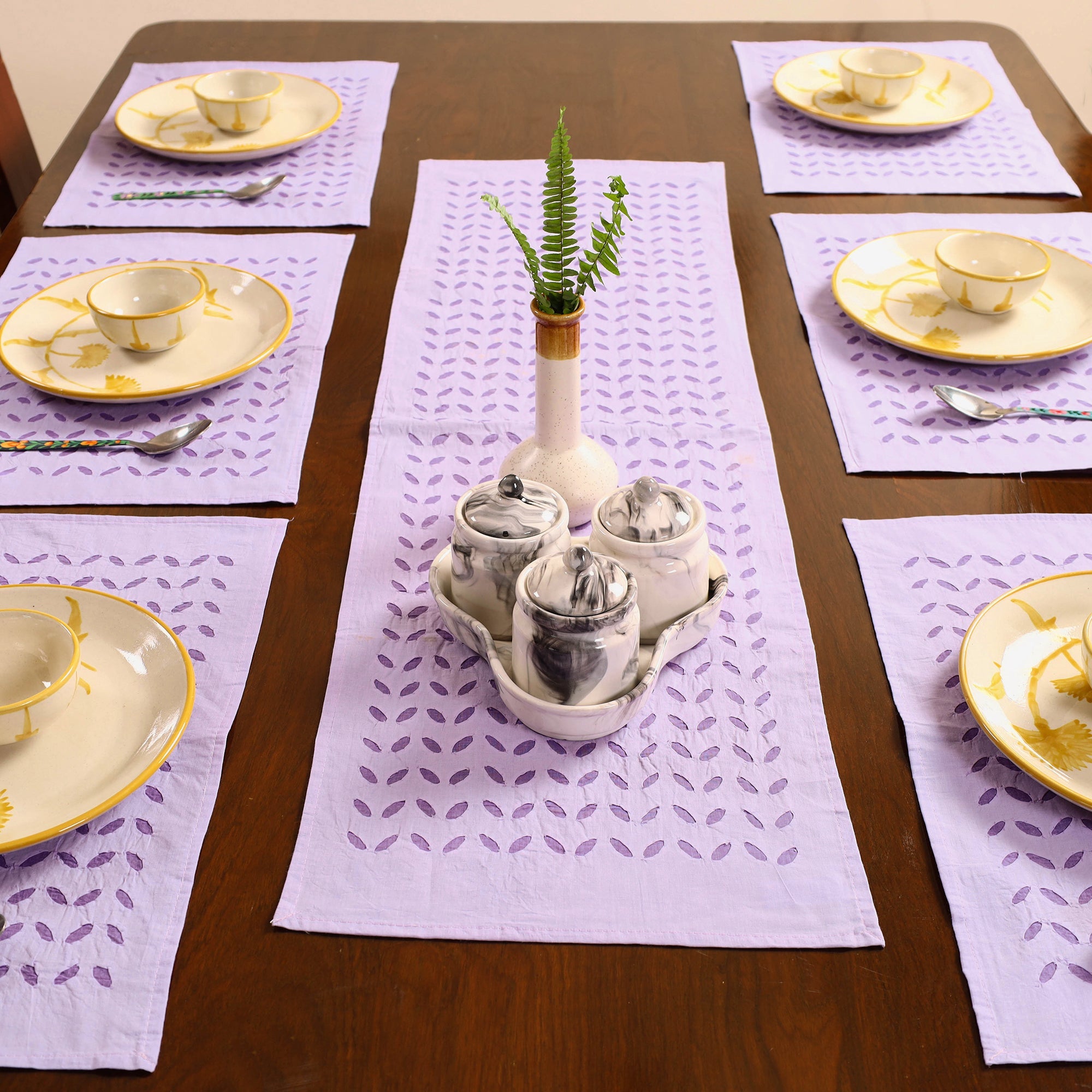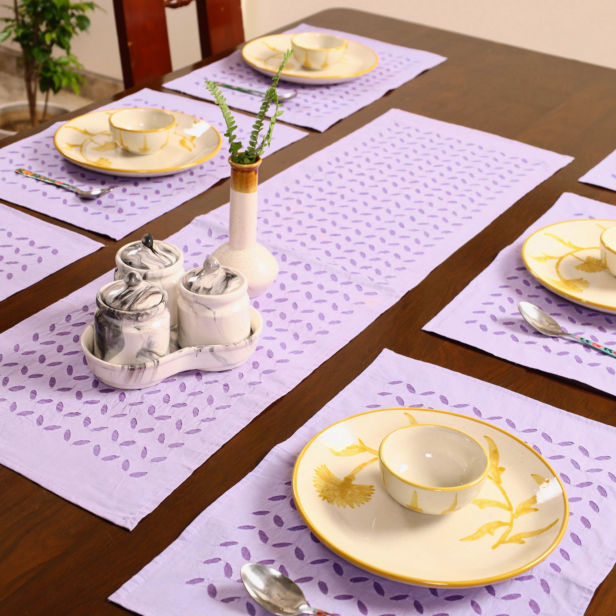 Enhance your dining experience with our exquisite purple applique cut work table runner with table mats. Crafted by skilled artisans from Barmer, Rajasthan, this set features intricate patterns that create a captivating interplay of light and shade. Made from fine quality cotton, it combines elegance with durability. Ideal for making a statement at any gathering, this artisanal piece brings a touch of tradition and sophistication to your home.