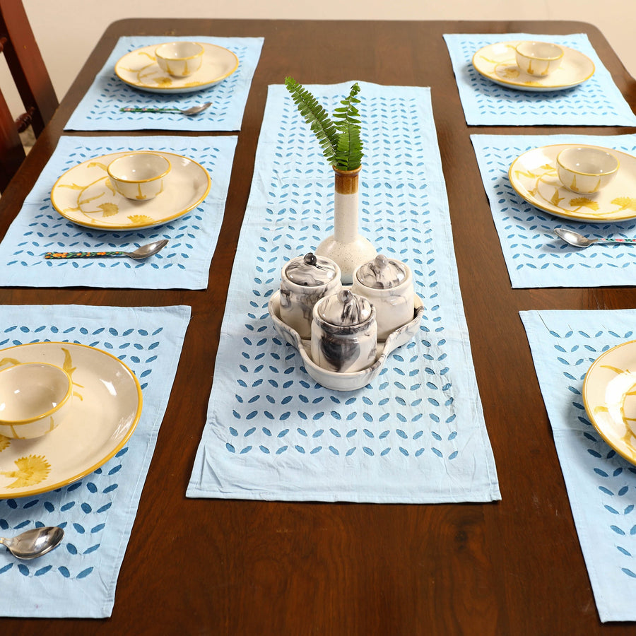 Enhance your dining experience with our exquisite blue applique cut work table runner with table mats. Crafted by skilled artisans from Barmer, Rajasthan, this set features intricate patterns that create a captivating interplay of light and shade. Made from fine quality cotton, it combines elegance with durability. Ideal for making a statement at any gathering, this artisanal piece brings a touch of tradition and sophistication to your home.