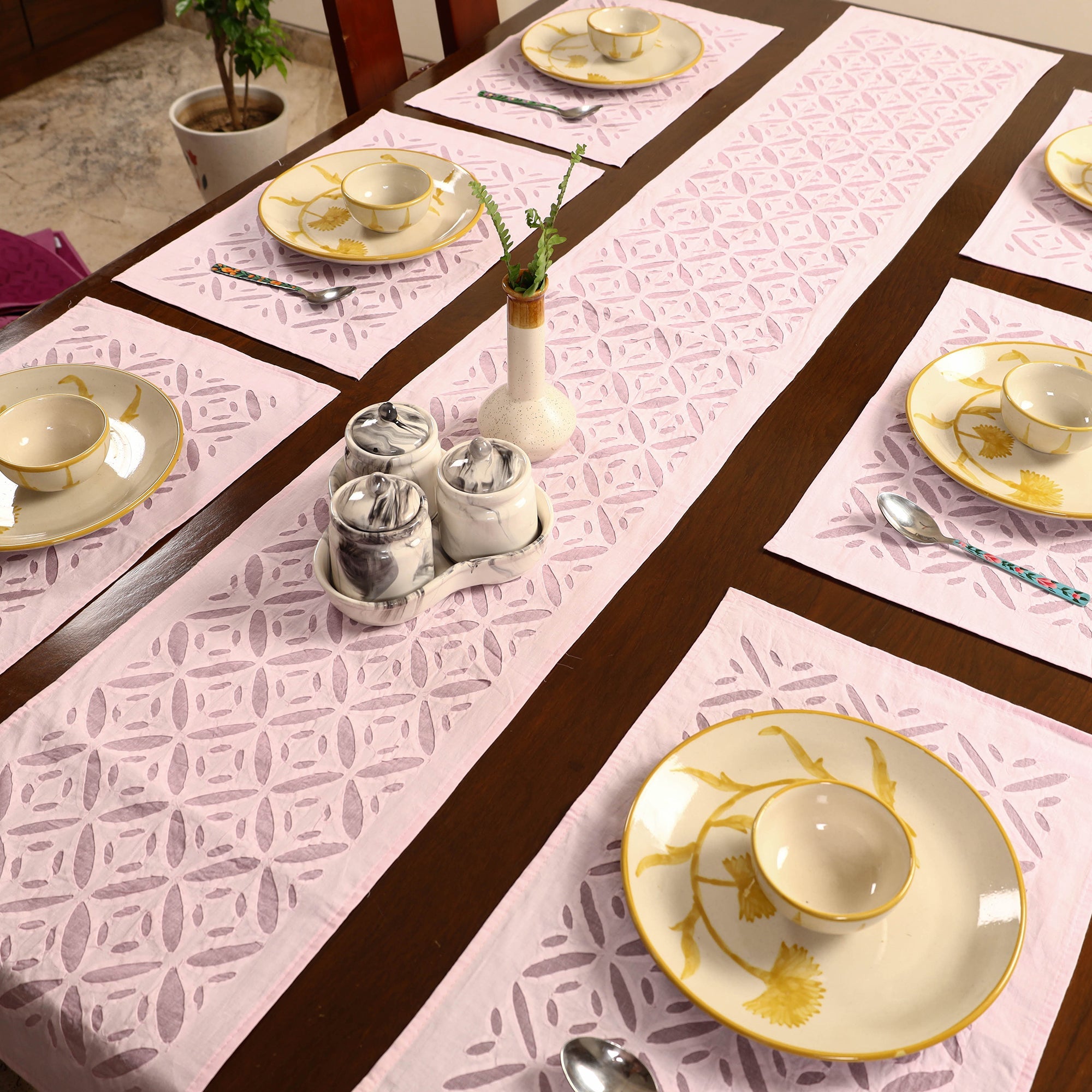 Enhance your dining experience with our exquisite purple applique cut work table runner with table mats. Crafted by skilled artisans from Barmer, Rajasthan, this set features intricate patterns that create a captivating interplay of light and shade. Made from fine quality cotton, it combines elegance with durability. Ideal for making a statement at any gathering, this artisanal piece brings a touch of tradition and sophistication to your home.