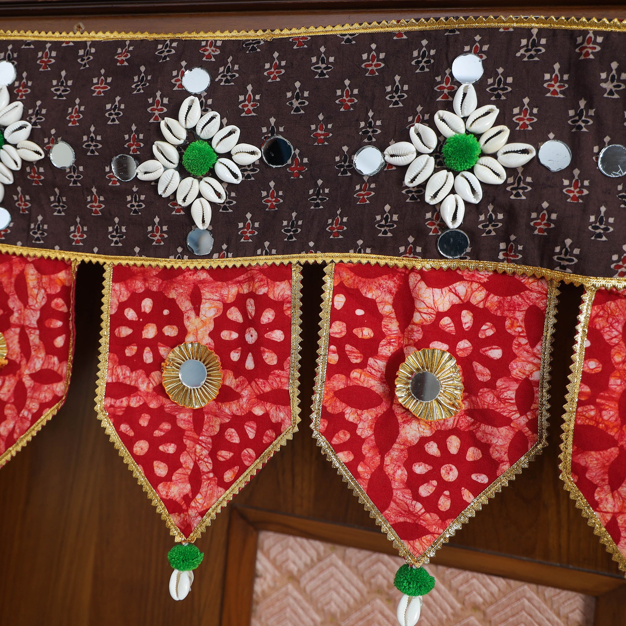 This handmade toran, adorned with a vibrant mix of cotton fabric, hand-painted wood, gota patti, shells, pompoms, puppets, and beads, adds a traditional touch to your home’s entrance. Torans have been a part of Indian decor for centuries, symbolizing auspiciousness. Ideal for festivals like Ganesh Chaturthi, Diwali, this toran blends age-old craftsmanship with contemporary designs, making it a perfect addition to any home.