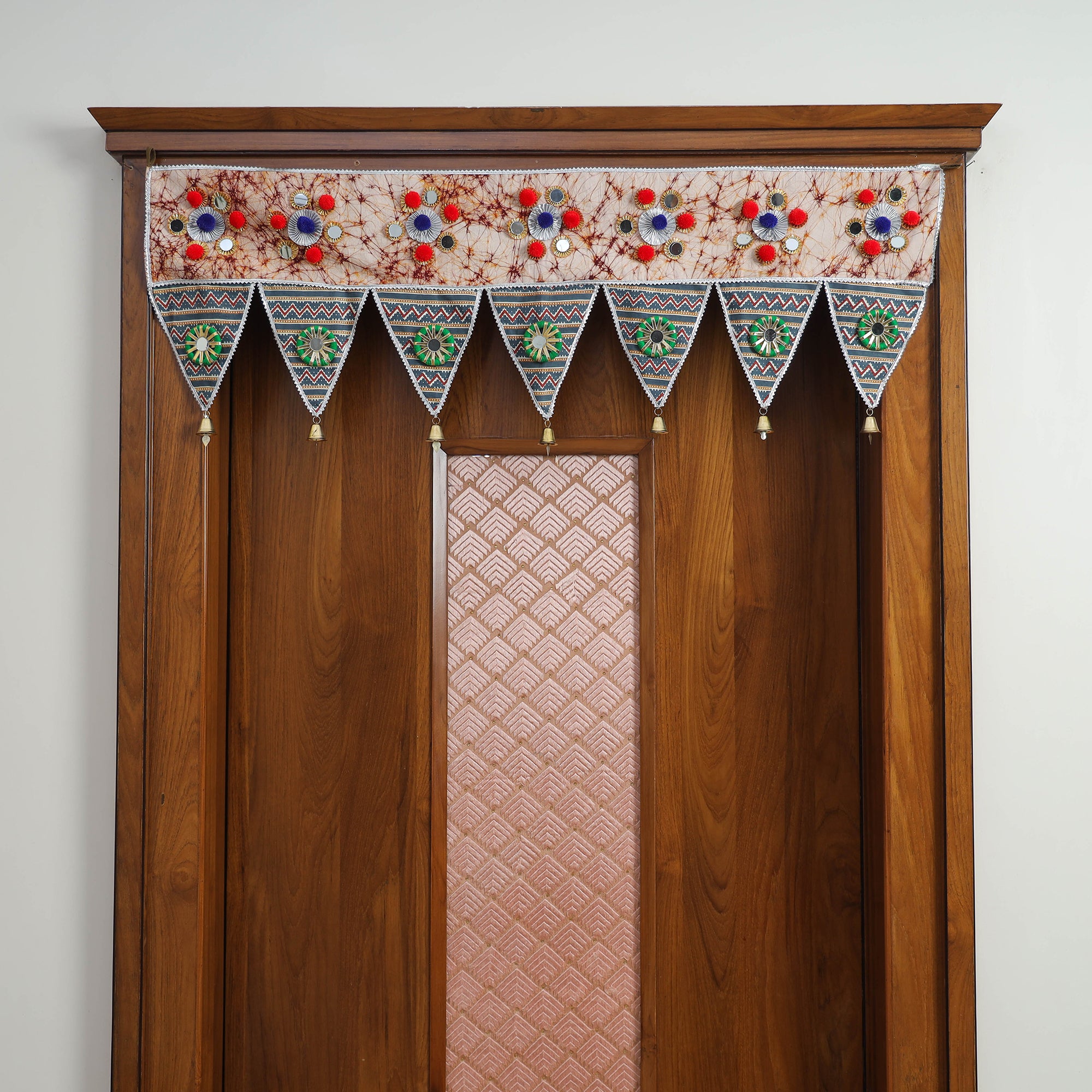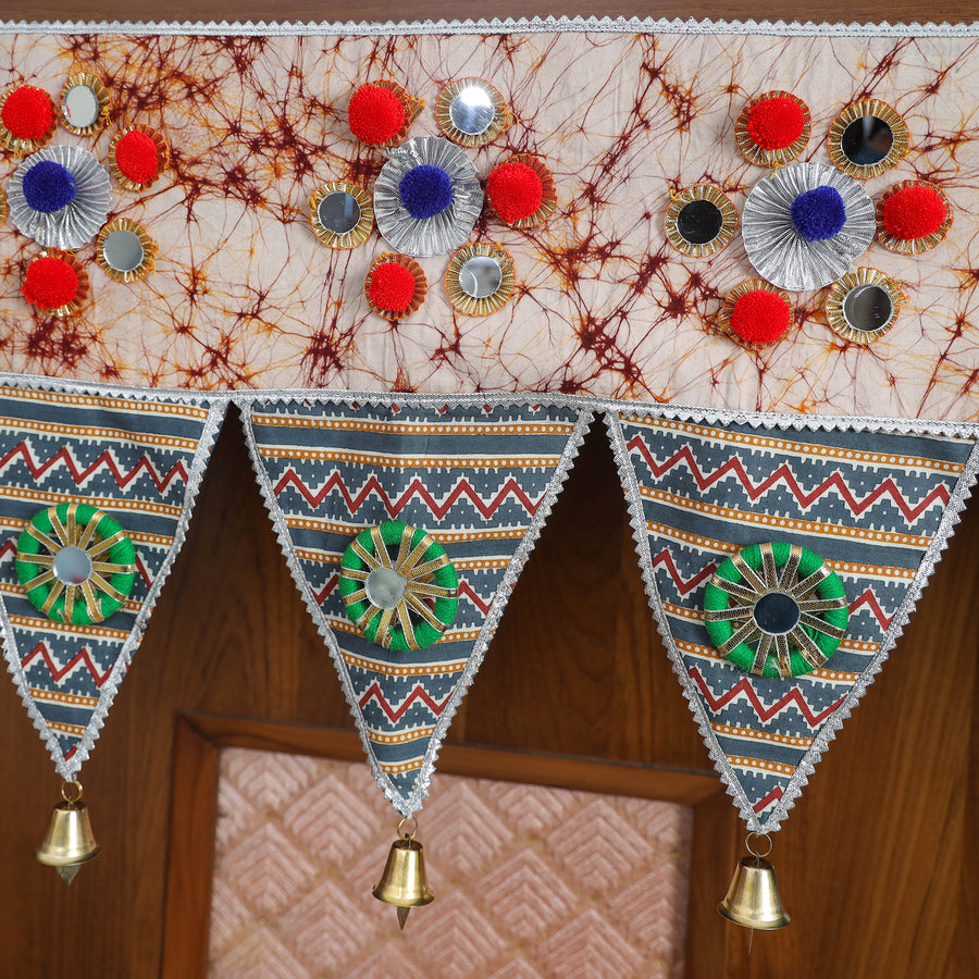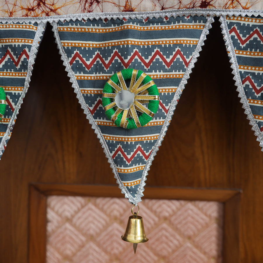 This handmade toran, adorned with a vibrant mix of cotton fabric, hand-painted wood, gota patti, shells, pompoms, puppets, and beads, adds a traditional touch to your home’s entrance. Torans have been a part of Indian decor for centuries, symbolizing auspiciousness. Ideal for festivals like Ganesh Chaturthi, Diwali, this toran blends age-old craftsmanship with contemporary designs, making it a perfect addition to any home.