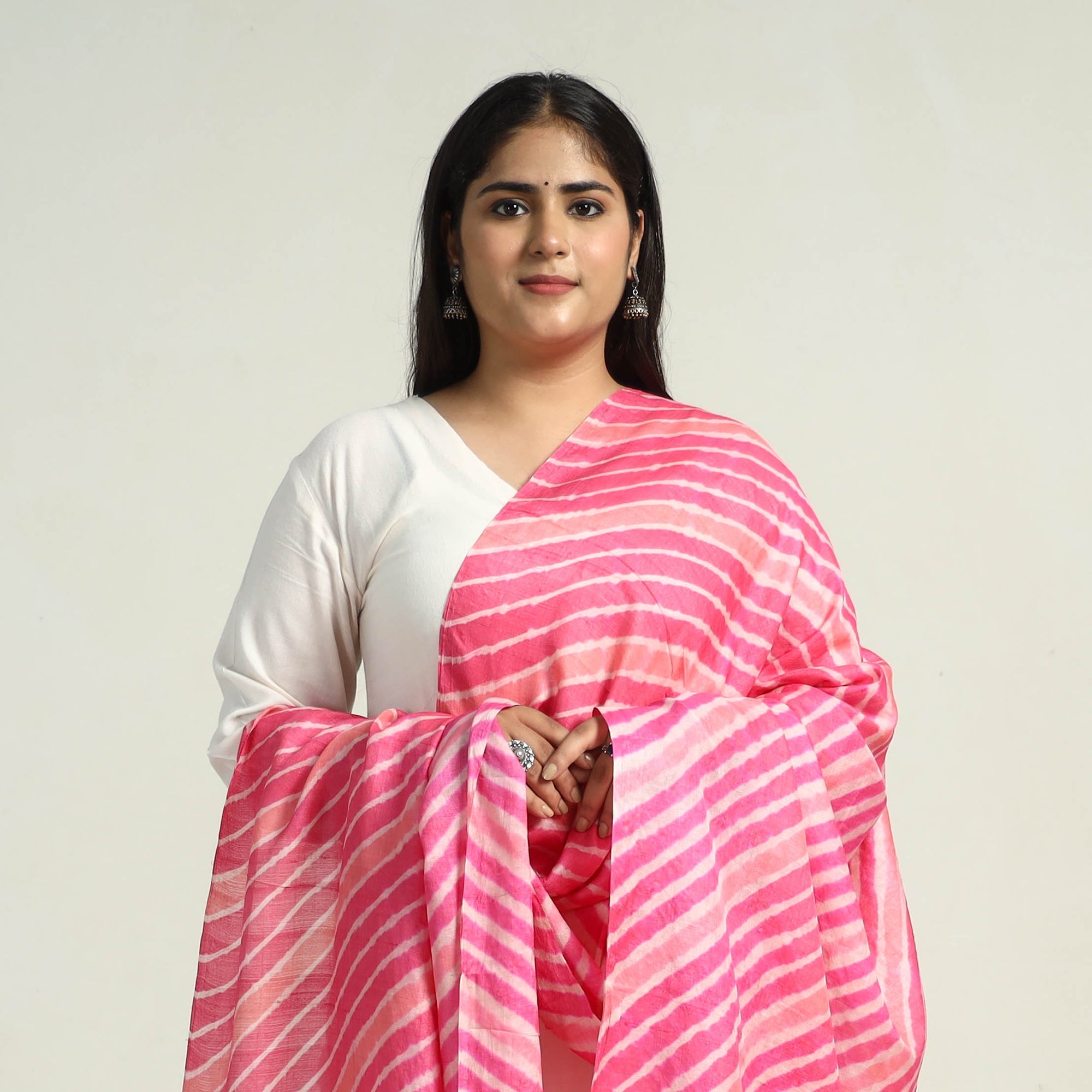 Experience the traditional tie & dye pink tussar silk handloom multicolour leheriya dupatta with tassels. The wavy patterns on this dupatta have been dyed using leheriya tie & dye technique through a traditional process by the master artisans from Rajasthan. Tussar silk is known for its unique texture, sheen of silk, and feel of cotton.
