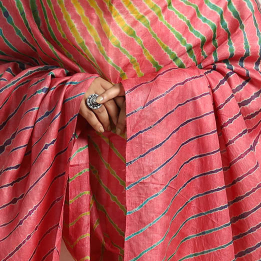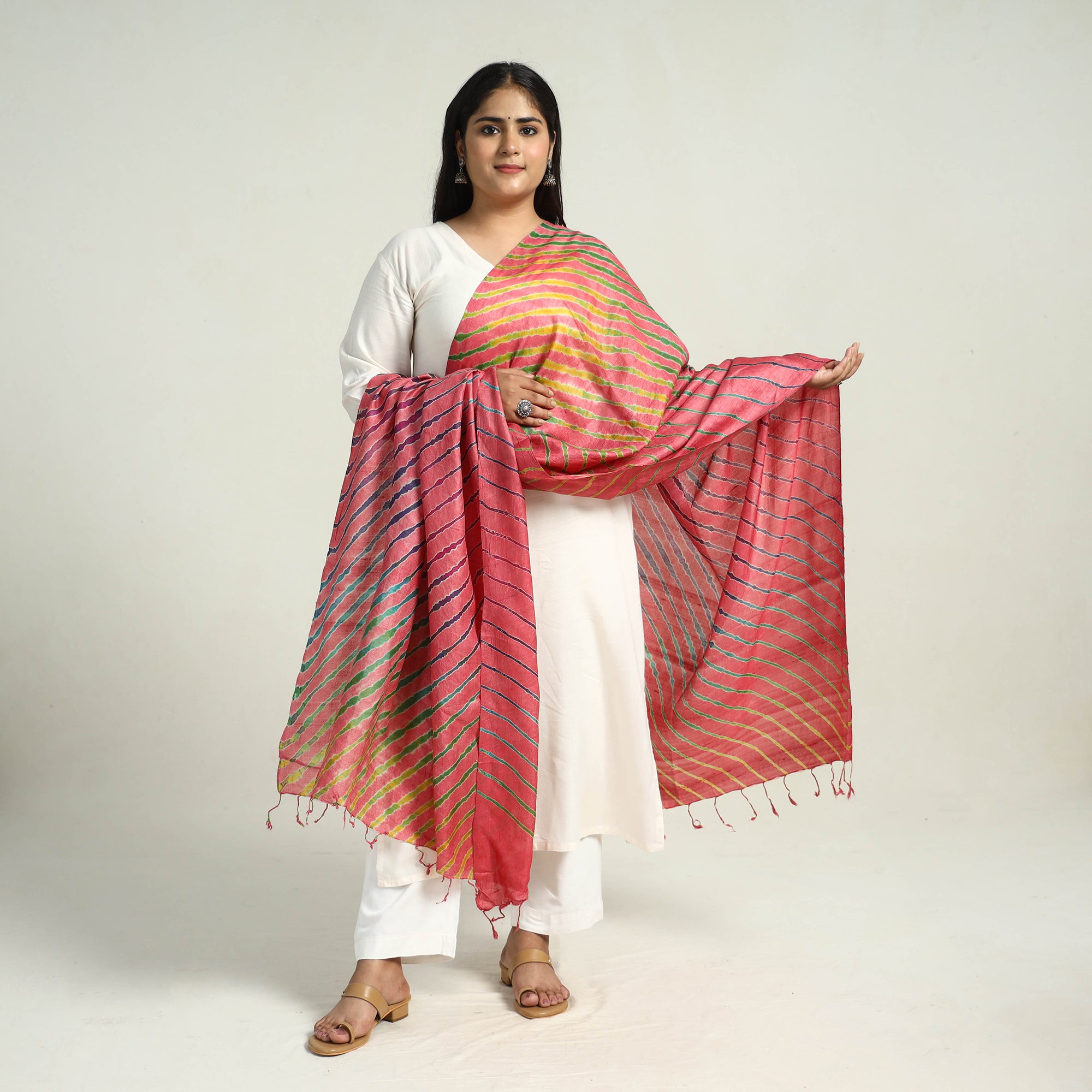 Experience the traditional tie & dye pink tussar silk handloom multicolour leheriya dupatta with tassels. The wavy patterns on this dupatta have been dyed using leheriya tie & dye technique through a traditional process by the master artisans from Rajasthan. Tussar silk is known for its unique texture, sheen of silk, and feel of cotton.