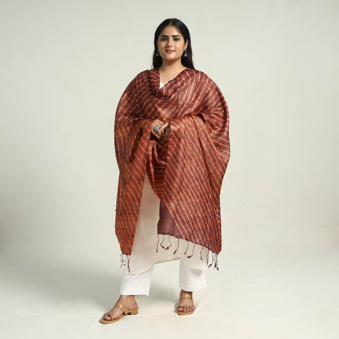 Experience the traditional tie & dye brown mothra tussar silk handloom leheriya dupatta with tassels. The wavy patterns on this dupatta have been dyed using leheriya tie & dye technique through a traditional process by the master artisans from Rajasthan. Tussar silk is known for its unique texture, sheen of silk, and feel of cotton.