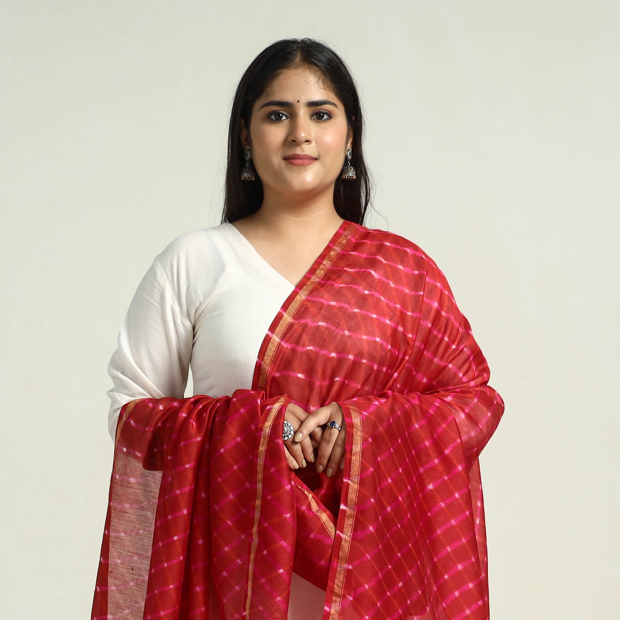 Experience the traditional tie & dye red mothra chanderi silk handloom leheriya dupatta with zari border. The wavy patterns on this dupatta have been dyed using the leheriya tie & dye technique through a traditional process by the master artisans from Rajasthan. The blend of chanderi silk and cotton gives it a look and a luxurious feel.