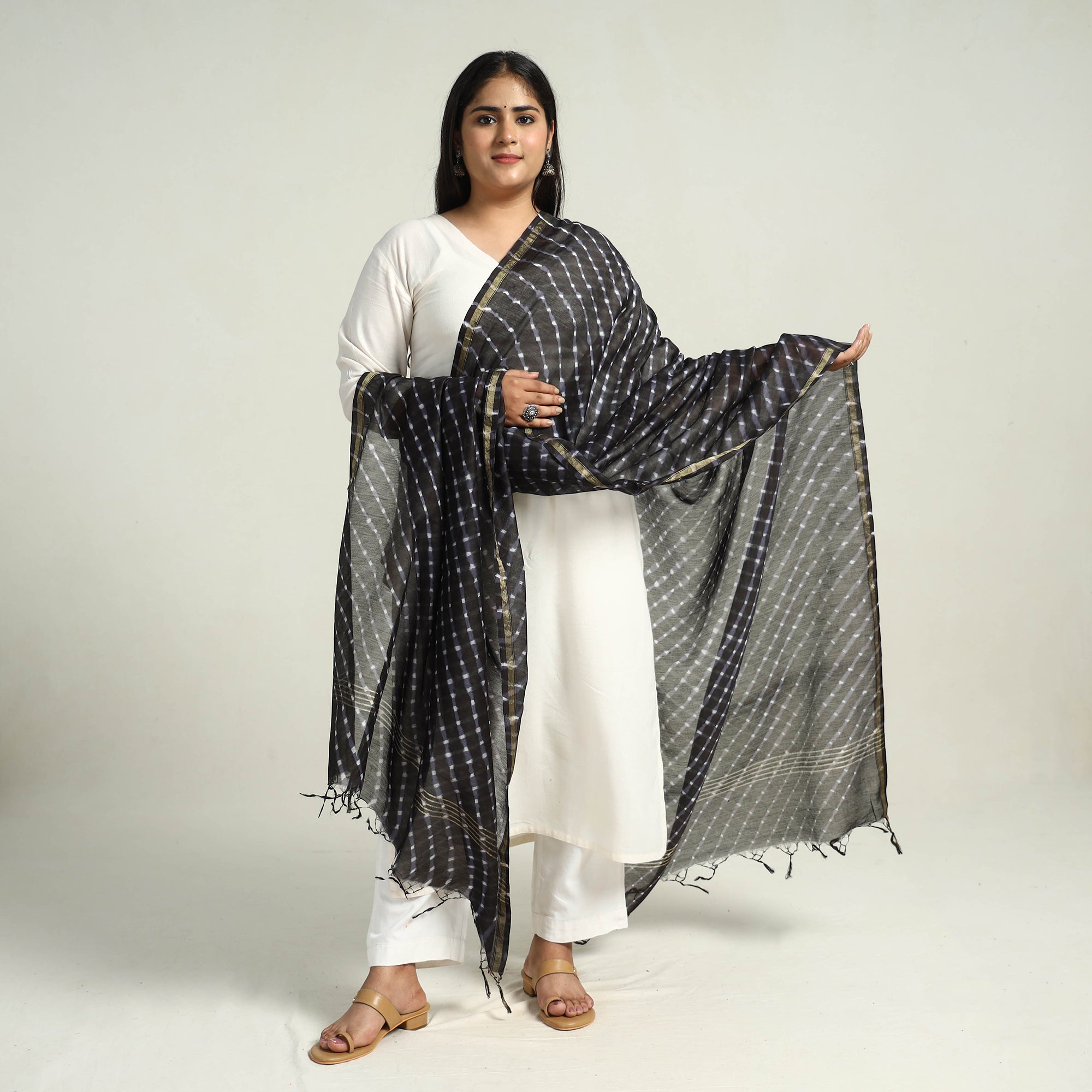 Experience the traditional tie & dye black mothra chanderi silk handloom leheriya dupatta with zari border. The wavy patterns on this dupatta have been dyed using the leheriya tie & dye technique through a traditional process by the master artisans from Rajasthan. The blend of chanderi silk and cotton gives it a look and a luxurious feel.